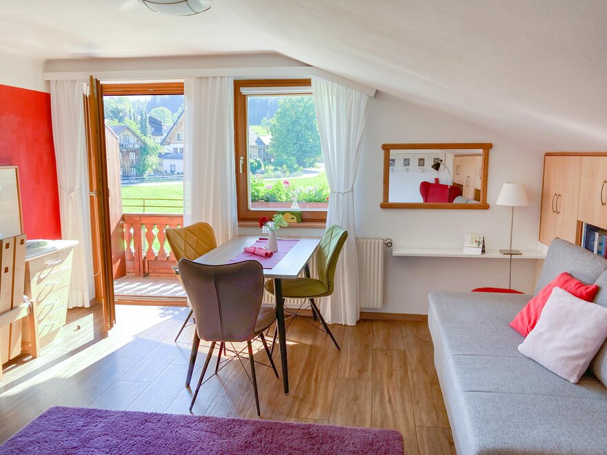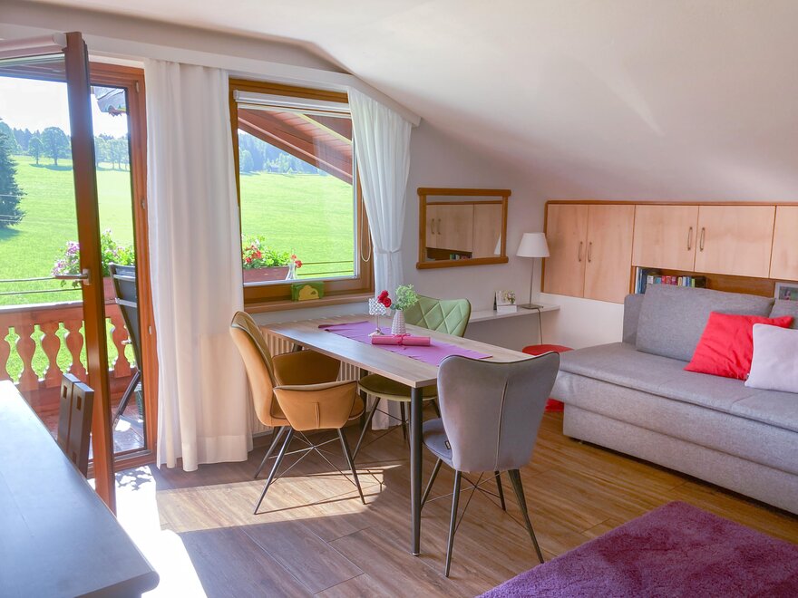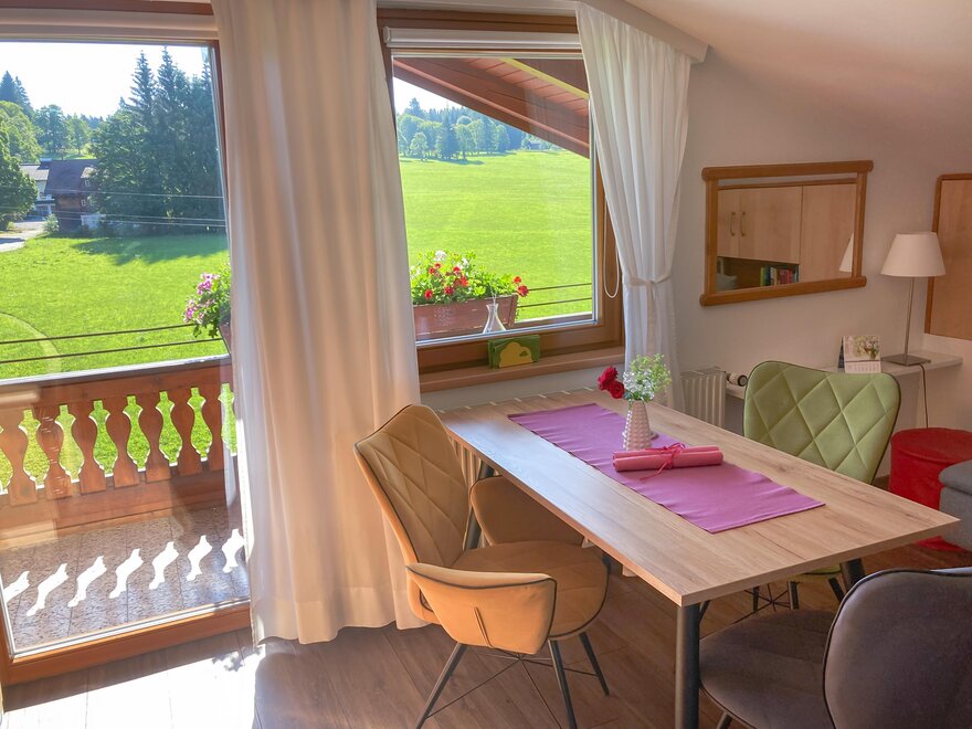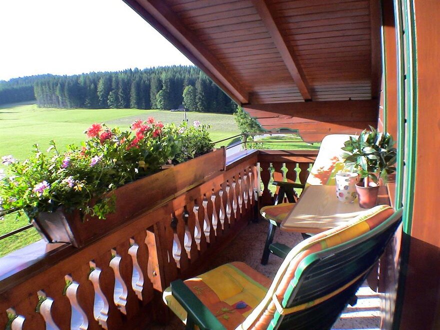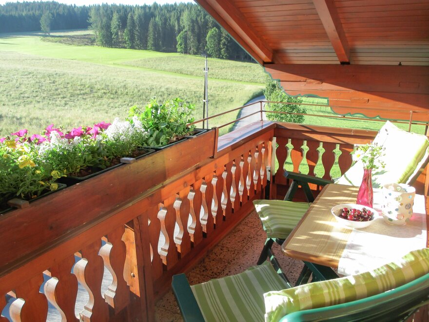 - balkón s ranním sluncem a výhledem na okolní hory a louky.