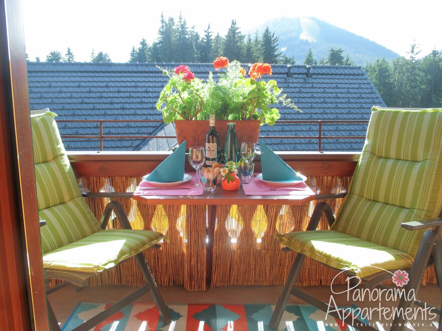 - Balkon s odpoledním sluncem a výhledem na naši Rittisberg