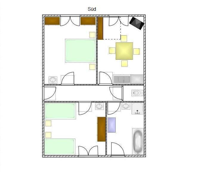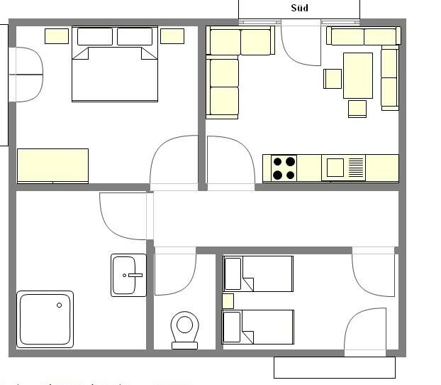 2 dvoulůžkové pokoje (jediný z nich buď se 2 jednolůžky, nebo také možnost spojení), obytná kuchyně, sprcha a extra WC