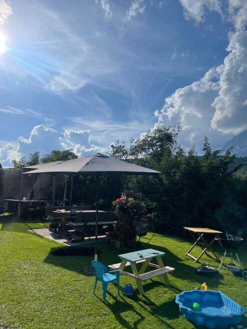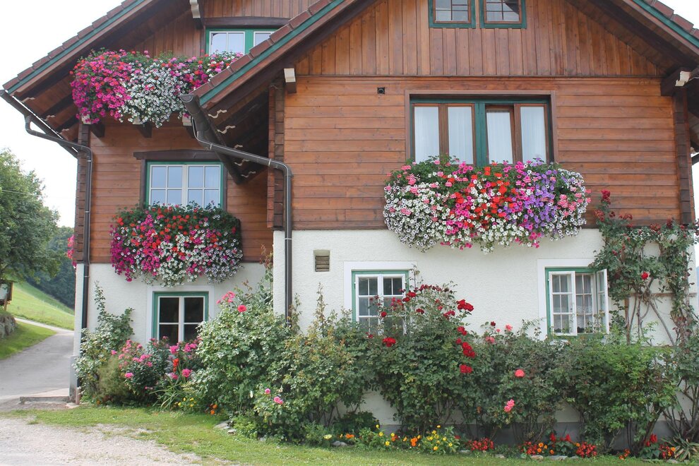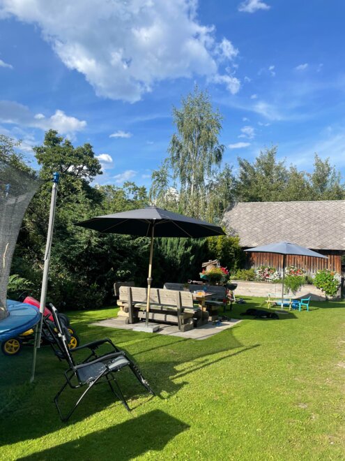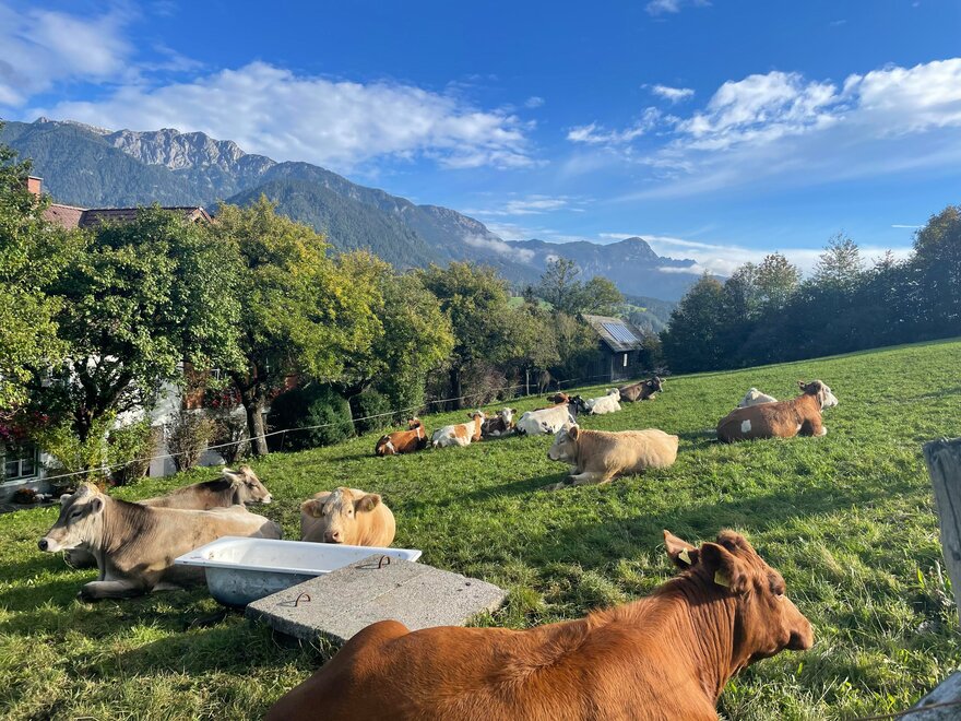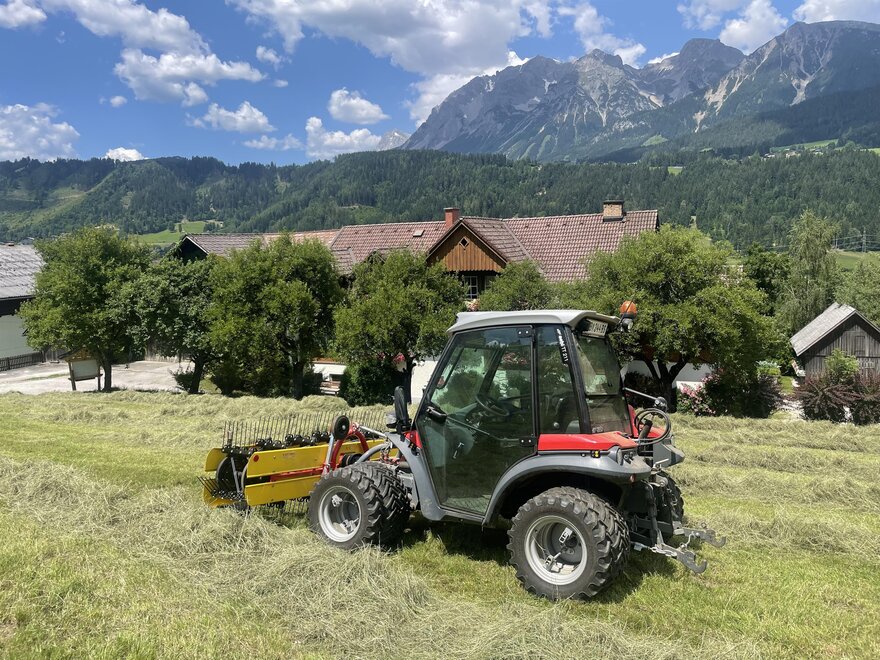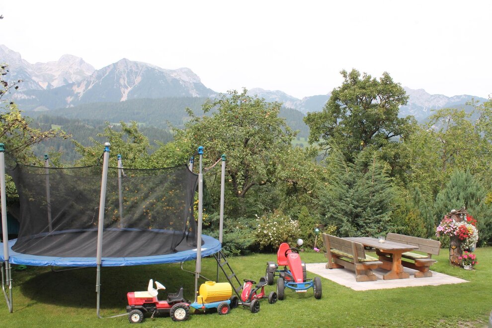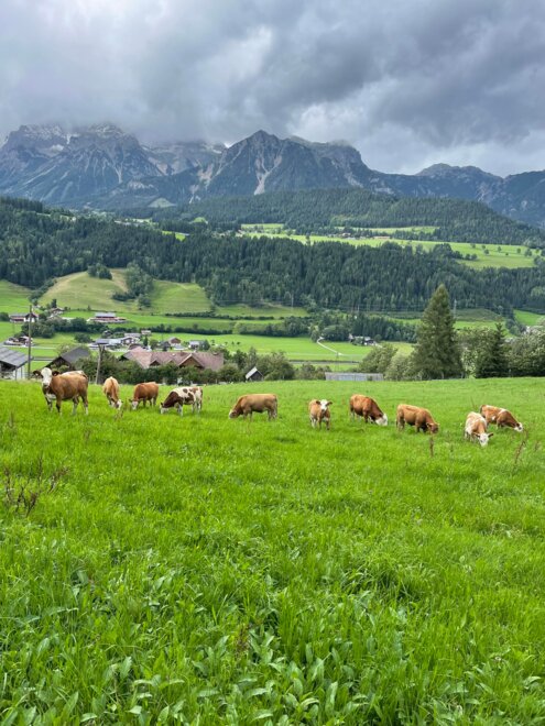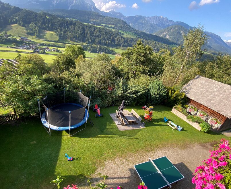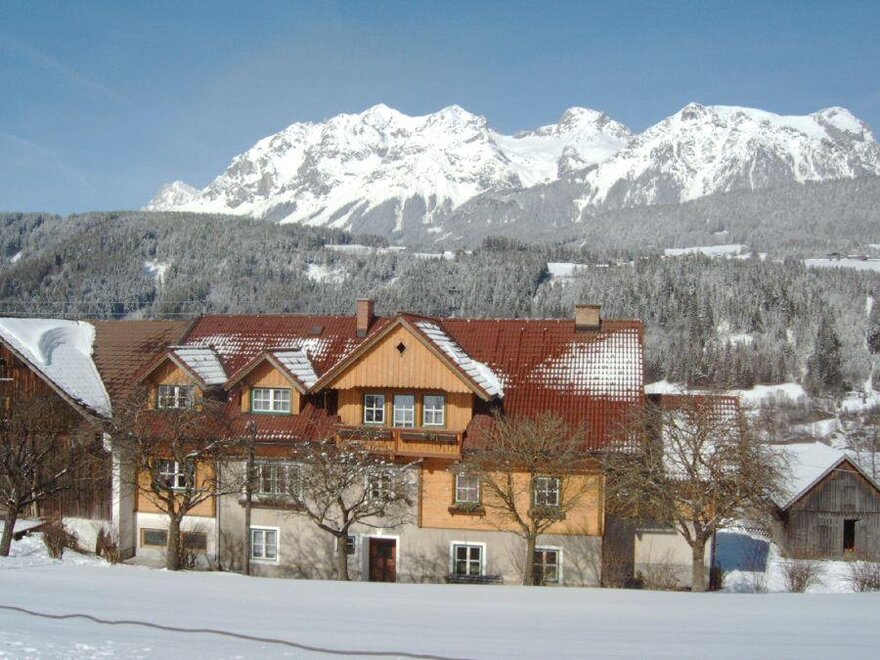 Lehce vyvýšená poloha nabízí ohromující výhled přes Ennstal na protilehlé pohoří Dachstein.