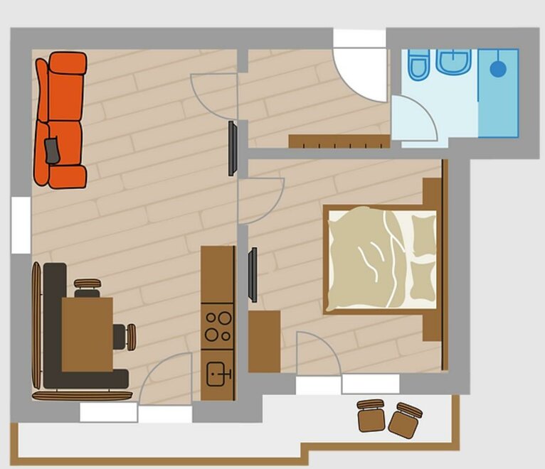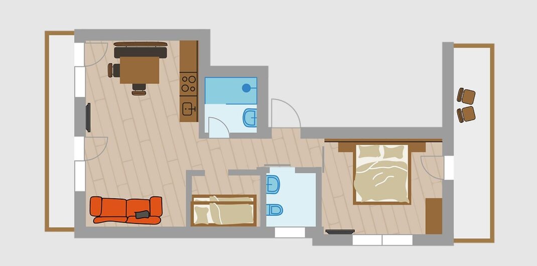 Apartmán B - Dva balkony s výhledem a příjemnou klidnou polohou, jedna ložnice (možnost přikoupit další ložnici s vlastním koupelnou), cool patrová postel, rozkládací pohovka, koupelna, samostatné WC, televizor v rodičovské ložnici a v kuchyni, stejně jako Wi-Fi. V tomto prostorném apartmánu se cítí pohodlně až šest hostů.