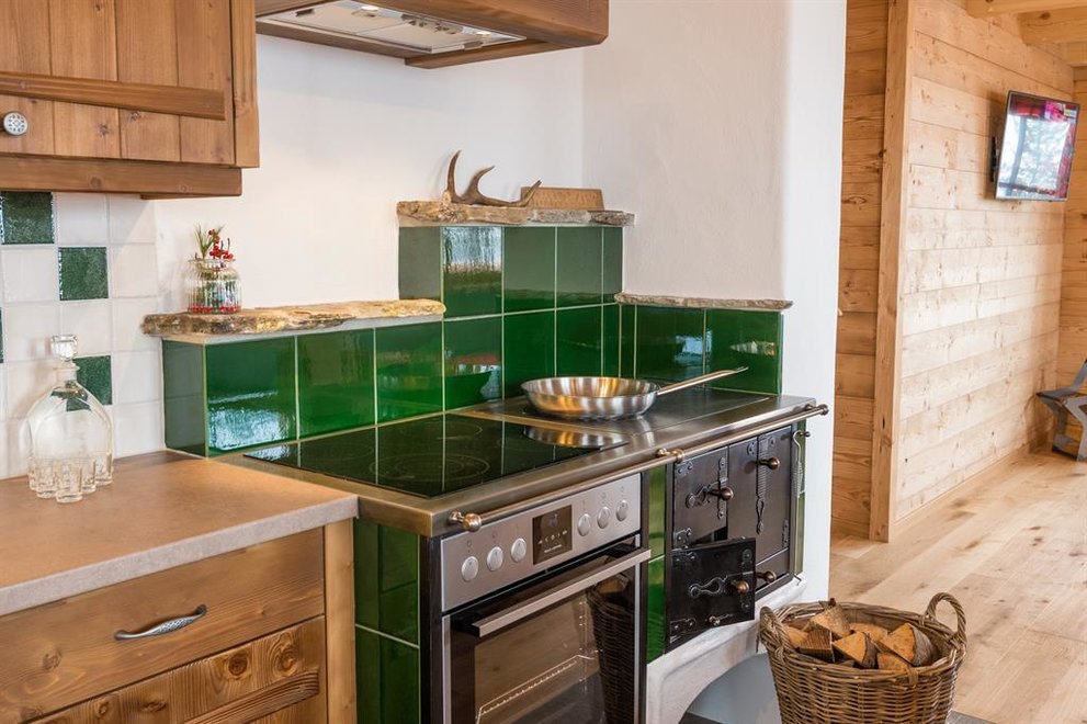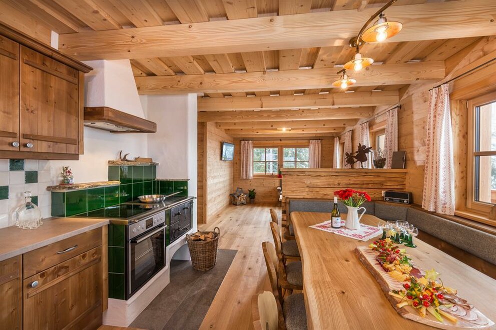 - Přízemí: Útulný obývací a jídelní prostor v tradičním alpském stylu s dřevěnou kamna, pohovkou, TV a plně vybavenou kuchyní,