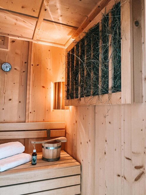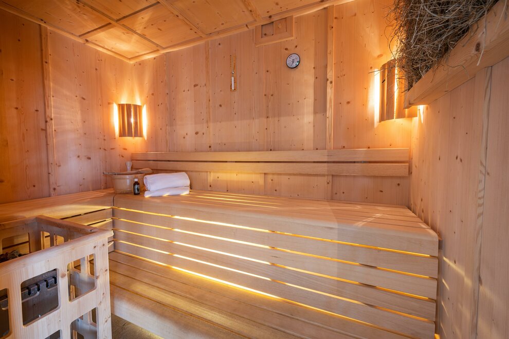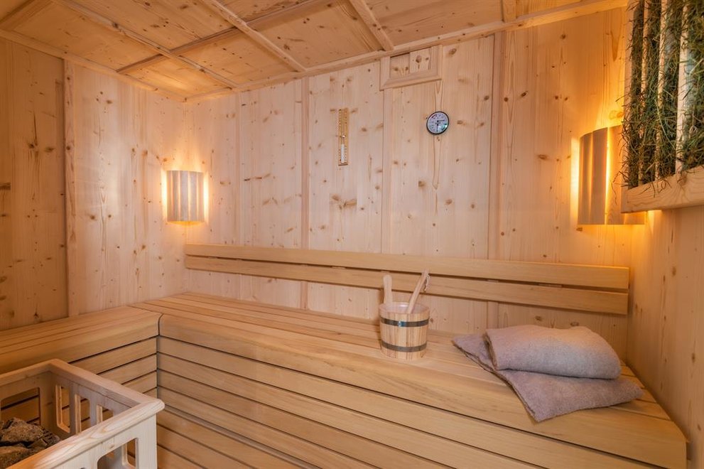 Komfortní alpský wellness prostor s bylinkovou saunou, lehátky, wellness sprchou a venkovní sprchou