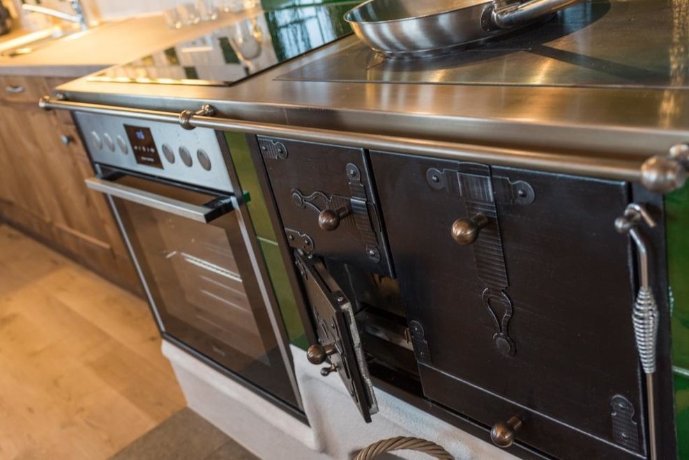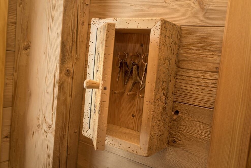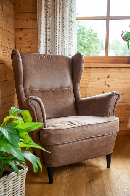- Přízemí: Pohodlná obytná a jídelní část v tradičním alpském stylu s dřevěným sporákem, pohovkou, TV a plně vybavenou kuchyní,
