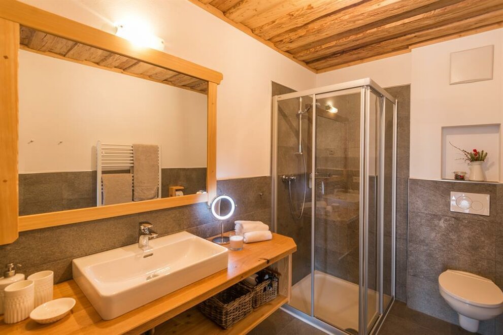 Nádherně upravená alpská zahrada s bylinkovou zahradou, lehátky, přenosným grilem, fontánou a sedací soupravou - Patro: 1 dvojlůžkový pokoj, 2 třílůžkové pokoje, koupelna s WC a samostatné WC