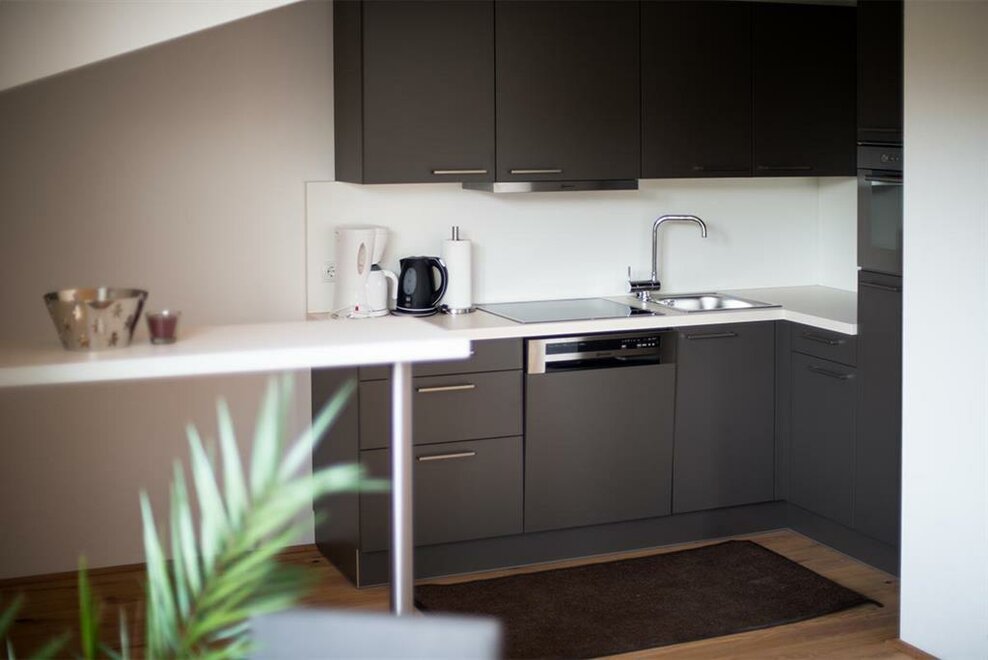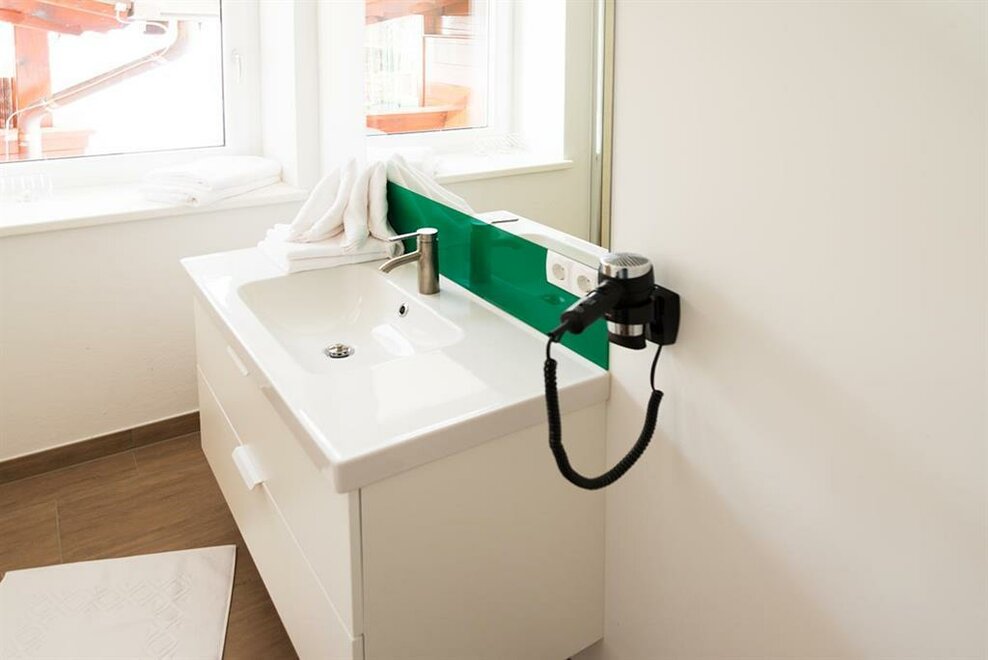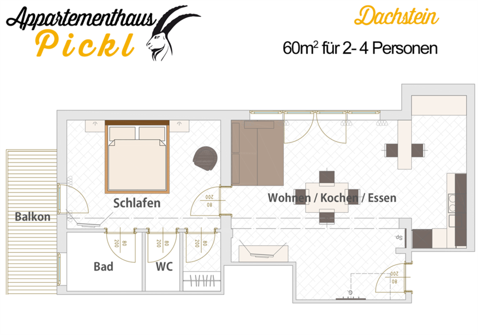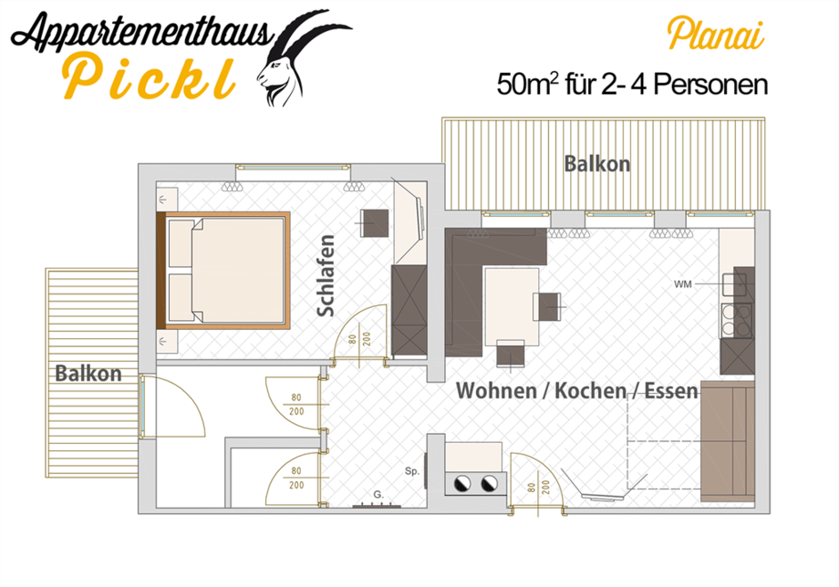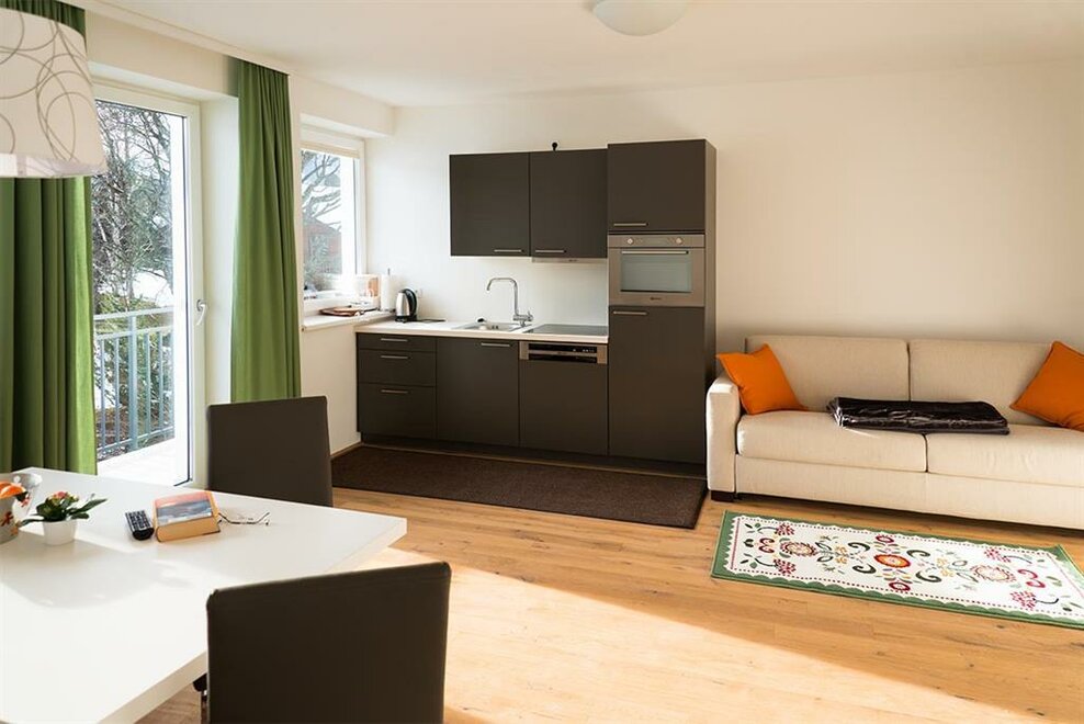 50 metrů čtverečních apartmán pro 2 - 4 osoby * Obývací kuchyně je vybavena vším, co k tomu patří (včetně ploché TV). Rozkládací pohovka poskytuje navíc místo pro 2 další osoby. * Ložnice včetně manželské postele se nachází naproti předsíni na severovýchodní straně (je k dispozici další televize). * Balkon je orientován na východ a nabízí nádherný výhled na zelené louky Ramsau. * Koupelna a WC jsou samozřejmě oddělené. Bezplatné Wi-Fi, fén, osušky a župany jsou samozřejmostí!
