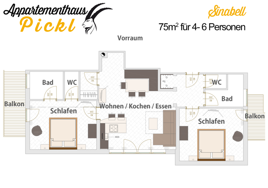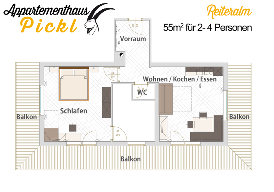 75 m² apartmán pro 4 - 6 osob * Obývací kuchyně je vybavena vším, co k tomu patří (včetně ploché TV). Rozkládací pohovka nabízí navíc místo pro 2 další osoby. * Dvě ložnice se dvěma manželskými postelemi jsou orientovány na severovýchod a jihovýchod. Obě se nacházejí naproti sobě, mezi obývací kuchyní. Každý pokoj je vybaven extra televizorem. * Balkon je orientován na severovýchod a jihovýchod a nabízí nádherné výhledy na luky a Schladminger Tauern. * Koupelna a WC jsou samozřejmě oddělené. Bezplatné Wi-Fi, kuchyňské náčiní (vařicí a jídelní nádobí), ložní prádlo, fén, osušky a župany jsou samozřejmě k dispozici!