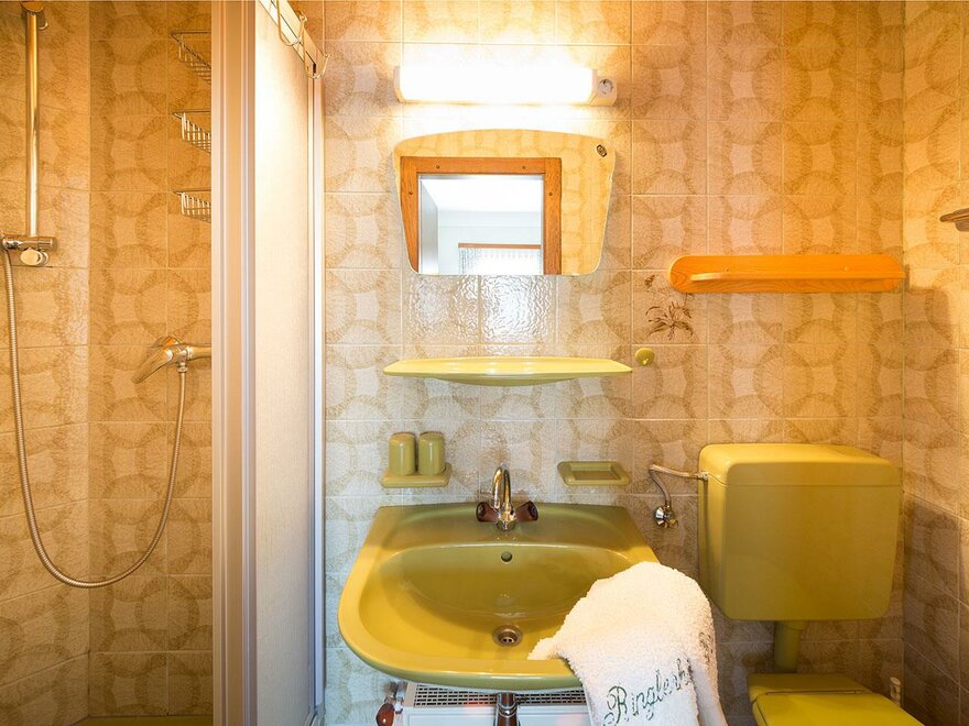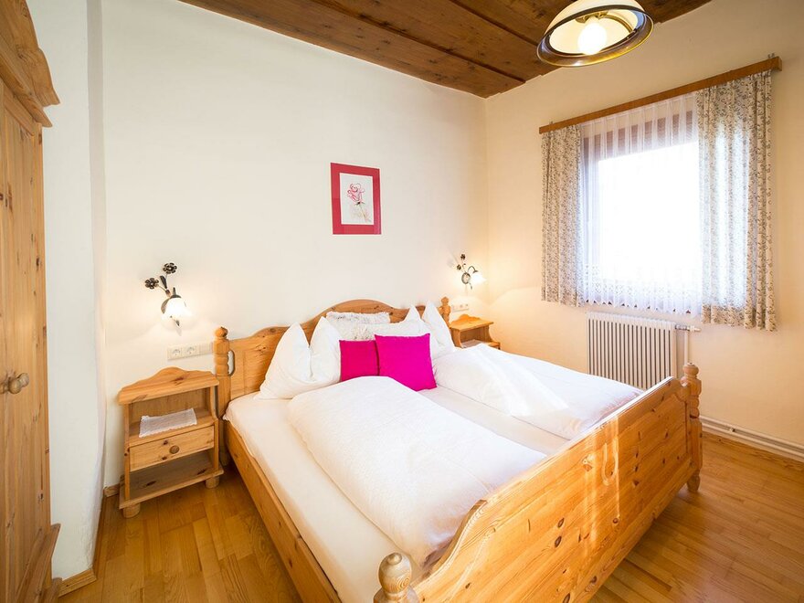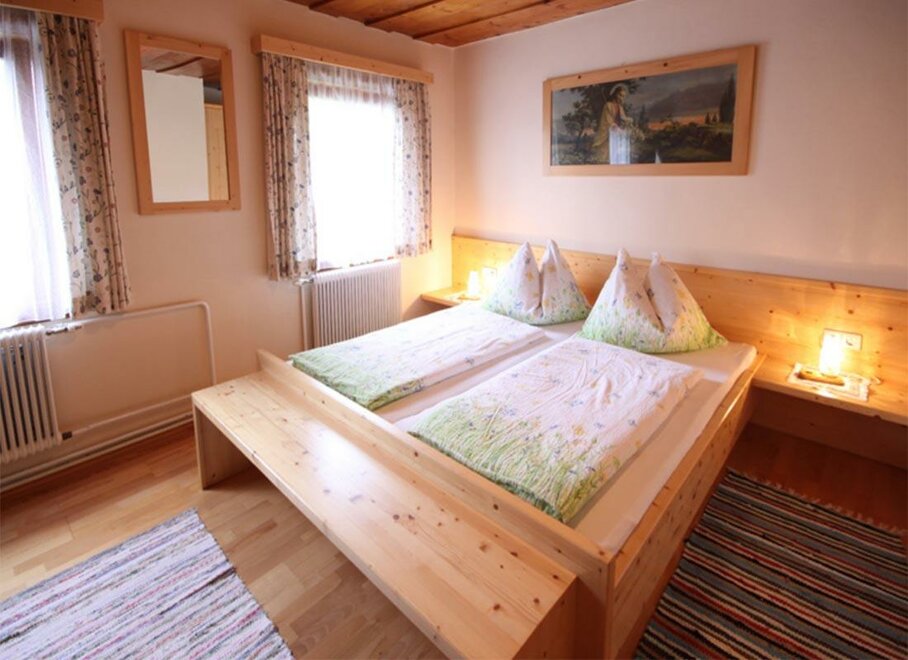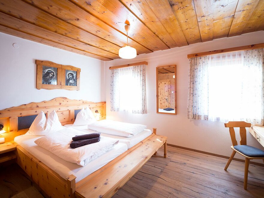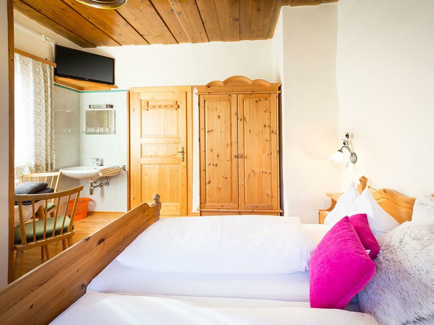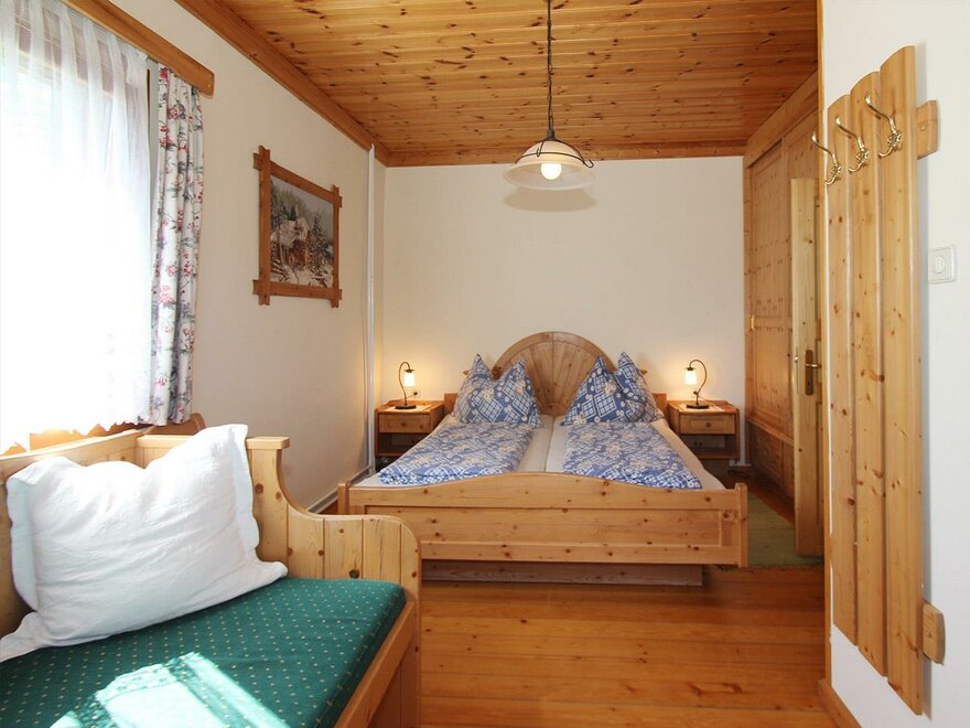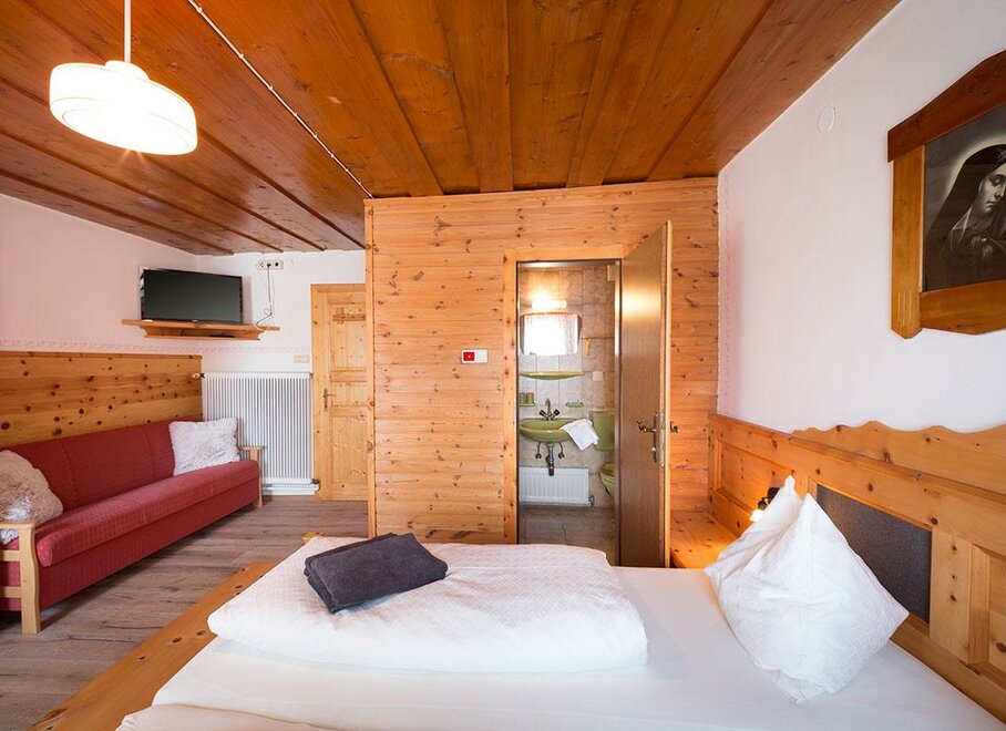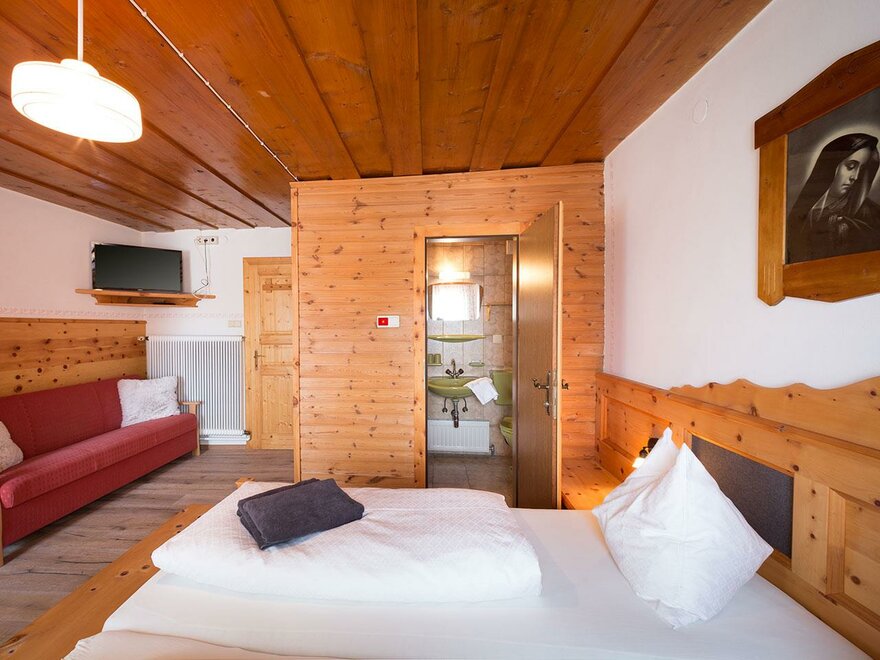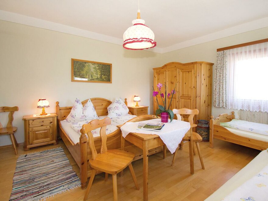 Prostorný rodinný pokoj s manželskou postelí a dvěma jednolůžkovými postelemi. Z tohoto pokoje máte přehled o veškerém dění na dvoře a užíváte si nádherný výhled na Dachstein.