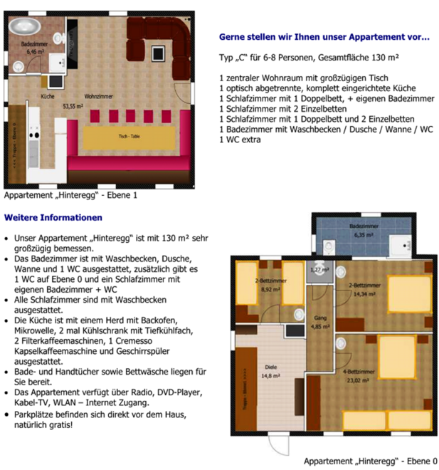 Apartmán "Hinteregg" pro 6-8 osob s prostornou obytnou plochou (130 m²) na 2 úrovních. Úroveň 1: Velká obytná část s jídelním stolem, u kterého najde místo 15 osob. 1 koupelna se sprchou, WC a vanou. Úroveň 0: Celkem 3 ložnice, dvě ložnice jsou navíc vybaveny umyvadlem. 1 ložnice s vlastní koupelnou a WC. 1 WC navíc na úrovni ložnic. Velká předsíň s šatnou a odkládací plochou na boty. Uzamykatelná úschovna lyží. Vytápěná sušárna na lyžařské oblečení. Sušička lyžařských bot pro suché a teplé nohy ráno.