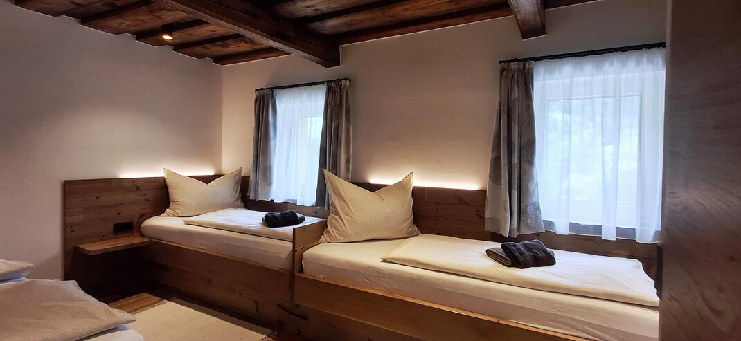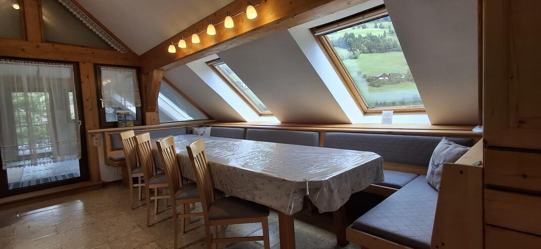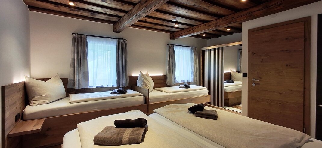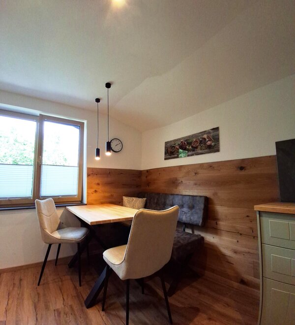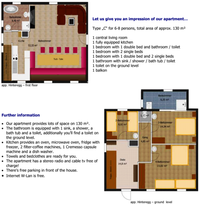 Apartmán "Hinteregg" pro 6-8 osob s prostornou obytnou plochou (130 m²) ve 2 úrovních. Úroveň 1: Velká obývací místnost se jídelním stolem, u kterého je místo pro 15 osob. 1 koupelna se sprchou, WC a vanou. Úroveň 0: Celkem 3 ložnice, dvě ložnice jsou navíc vybaveny umyvadlem. 1 ložnice s vlastní koupelnou a WC. 1 WC navíc na úrovni ložnic. Velká předsíň se šatní skříní a policí na boty. Uzamykatelná úschovna lyží. Vytápěná sušárna pro lyžařské oblečení. Sušička na lyžařské boty pro suché a teplé nohy ráno. Krásná, velká zahrada.