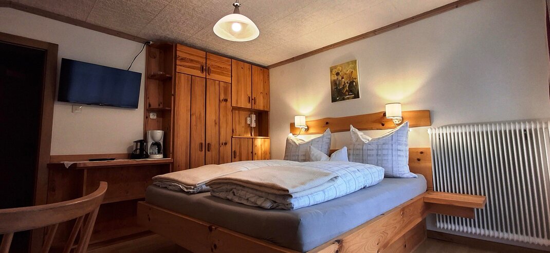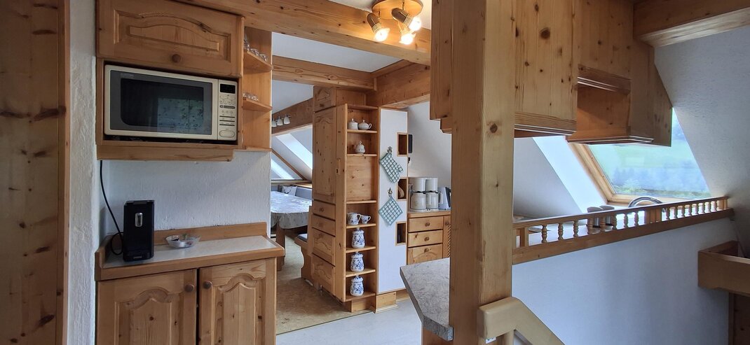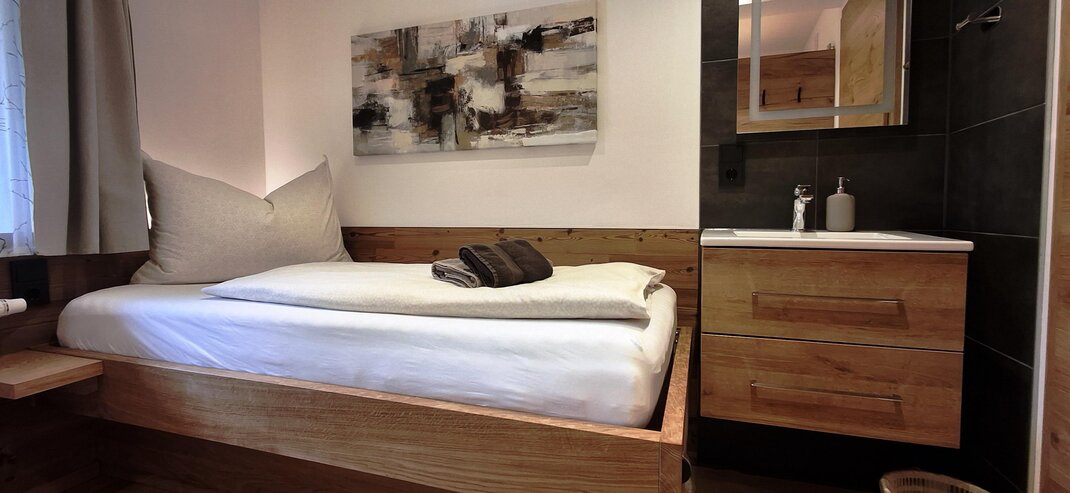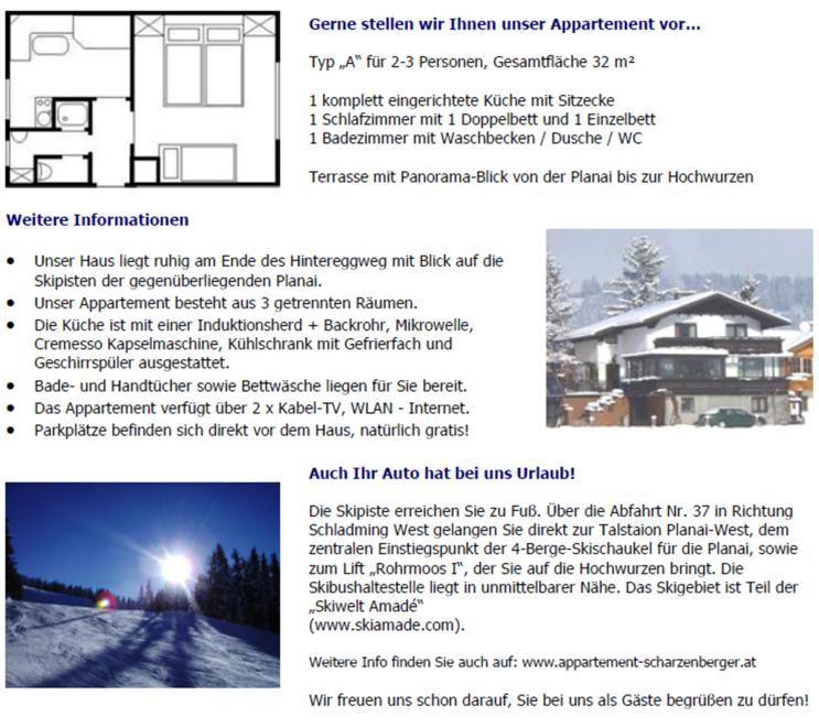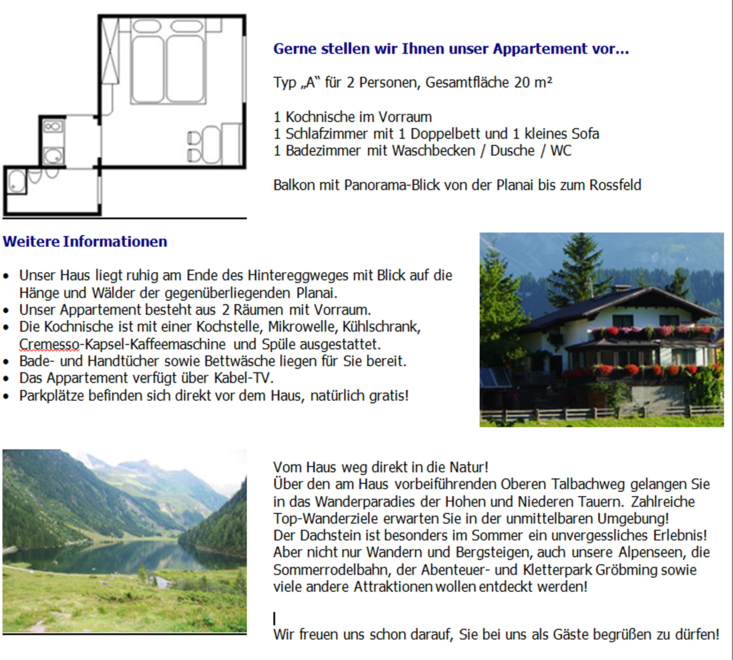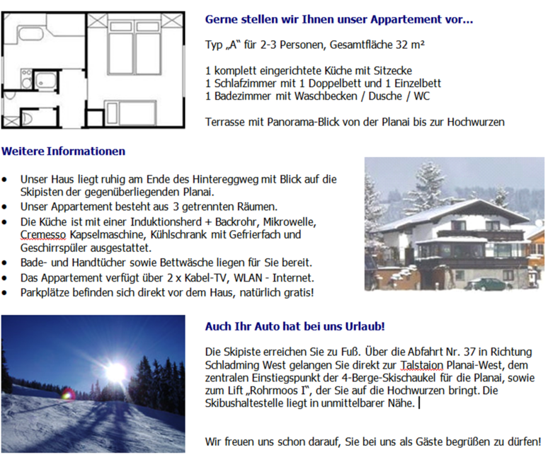 Apartmán typu „A“ „Rossfeld“ pro 2 osoby, celková plocha 25 m² 1 kuchyňský kout v předsíni 1 ložnice s 1 manželskou postelí 1 koupelna s umyvadlem / sprchou / WC Balkon s panoramatickým výhledem od Schladmingu přes Planai až po Hochwurzen • Kuchyně je vybavena vařičem, mikrovlnnou troubou, filtrovací kávovarem, lednicí a dřezem. • Osuška a ručníky, stejně jako povlečení jsou pro vás připraveny. • Apartmán má rádio, kabelovou TV a Wi-Fi internet.