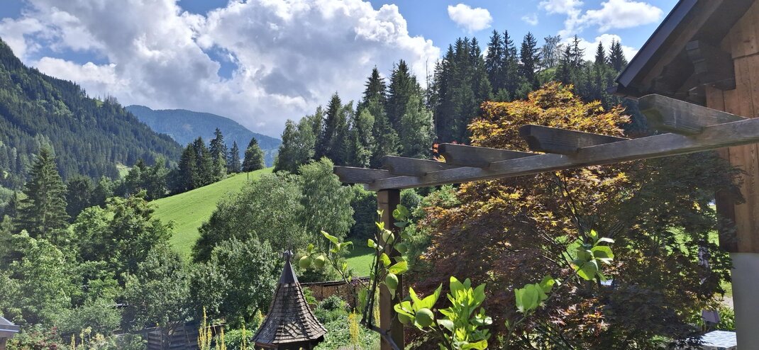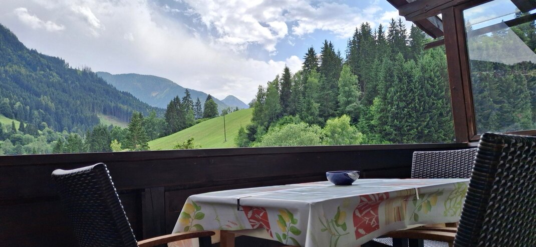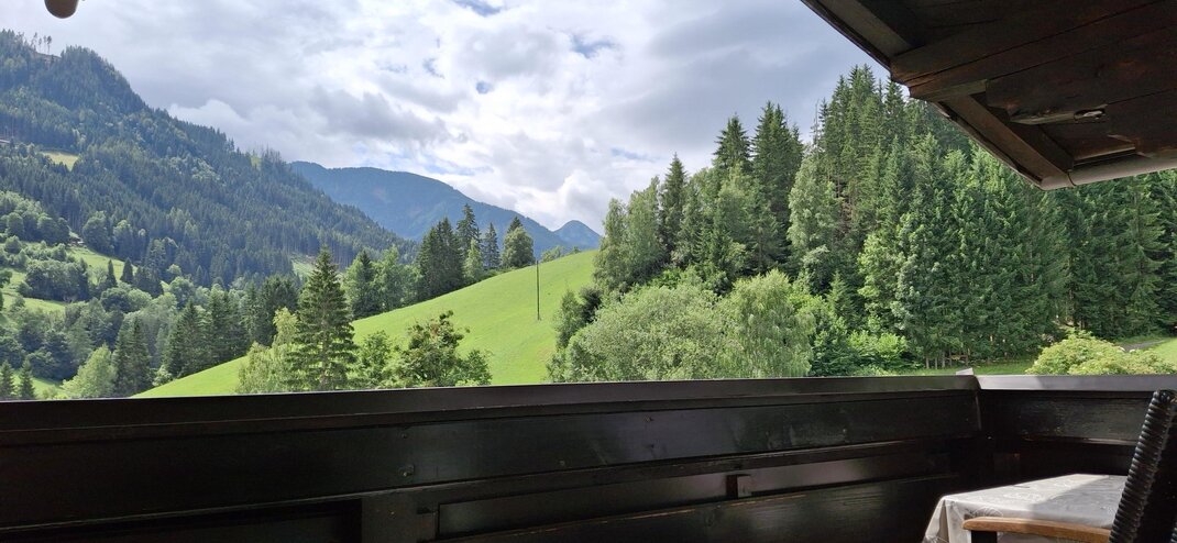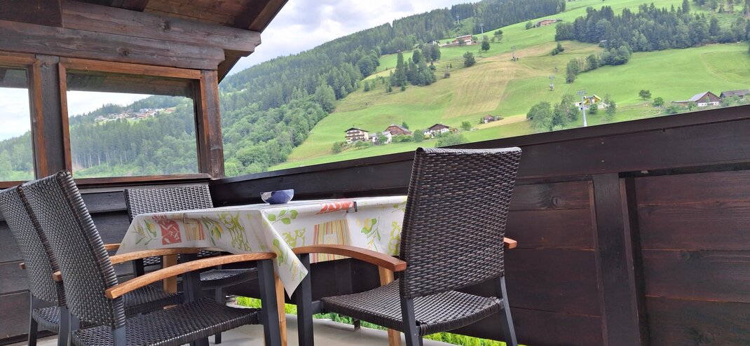 velký balkon s panoramatickým výhledem na Schladming, přes Planai až na Hochwurzen