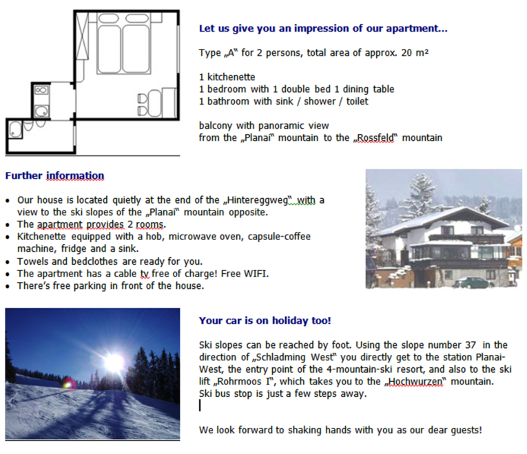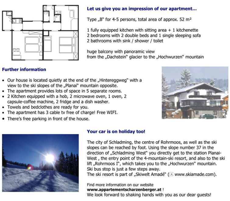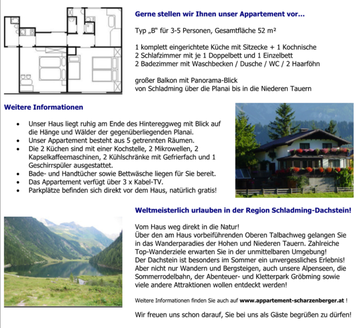 Náš dům se nachází v klidné lokalitě mezi centry obcí Schladming a Rohrmoos. Obě centra obcí jsou dostupná pěšky po stezkách mimo silnici do 15 minut. Restaurace, zastávka skibusu, lyžařská sjezdovka a také možnost přístupu na lyžařské oblasti Planai/Hochwurzen jsou během několika minut bez auta. Můžeme vám nabídnout v apartmánovém domě apartmány pro 2-5 osob a apartmán „Hinteregg“ (130 m²) pro 8 osob. Všechny apartmány jsou vybaveny balkónem nebo terasou. Obývací pokoj a ložnice jsou oddělené. Apartmány pro 3-5 osob a apartmán „Hinteregg“ mají myčku nádobí a mikrovlnnou troubu.