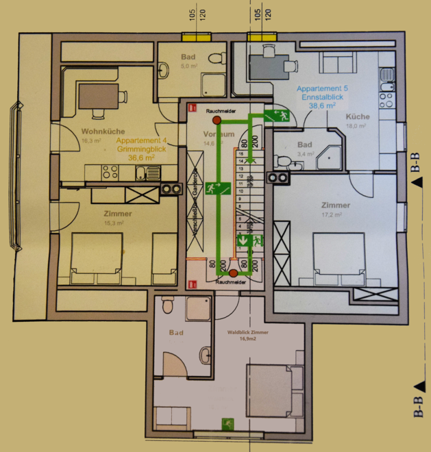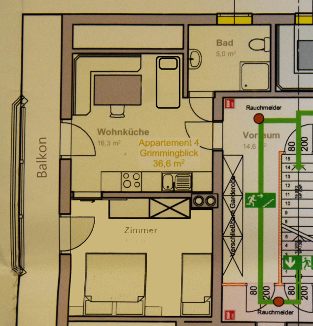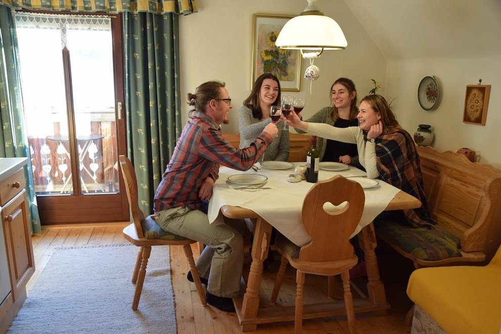Apartmán Grimmingblick s balkonem má nádherný slunečný výhled na okolní louky, lesy a Grimming (místní hora 2351 metrů). V ložnici je manželská postel a jednolůžko. Pro nejmenší navíc můžeme nastavit matraci nebo cestovní postýlku. V kuchyni je praktická 1-místná rozkládací pohovka, kterou lze využít jako přistýlku. Kuchyň je plně vybavená. WiFi je k dispozici všude. V koupelně je sprchový kout a toaleta. Jako biofarma máme mnoho domácích produktů a na přání splníme veškeré služby dle vašeho přání!