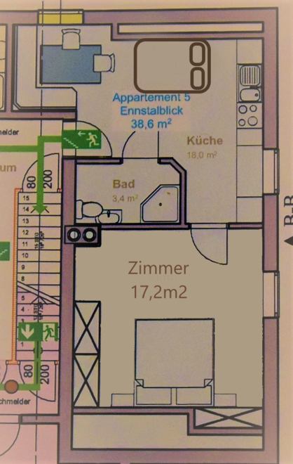 Apartmán Ennstalblick má prostorný výhled na celý Ennstal a hory za ním (místní hora Grimming 2351 metrů). V ložnici je manželská postel z masivu. V kuchyni je velmi kvalitní dvoulůžková rozkládací pohovka 160x200. Díky pohodlnému sezení nabízí dostatek místa pro 6 osob. V koupelně je WC, sprchový kout a sušák na ručníky. WiFi je k dispozici všude. Jako biofarma máme mnoho domácích produktů a na přání splníme veškeré služby dle vašeho přání!