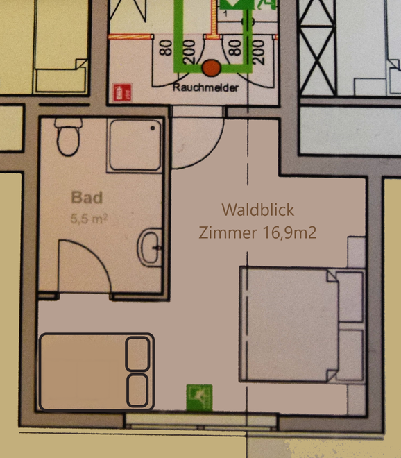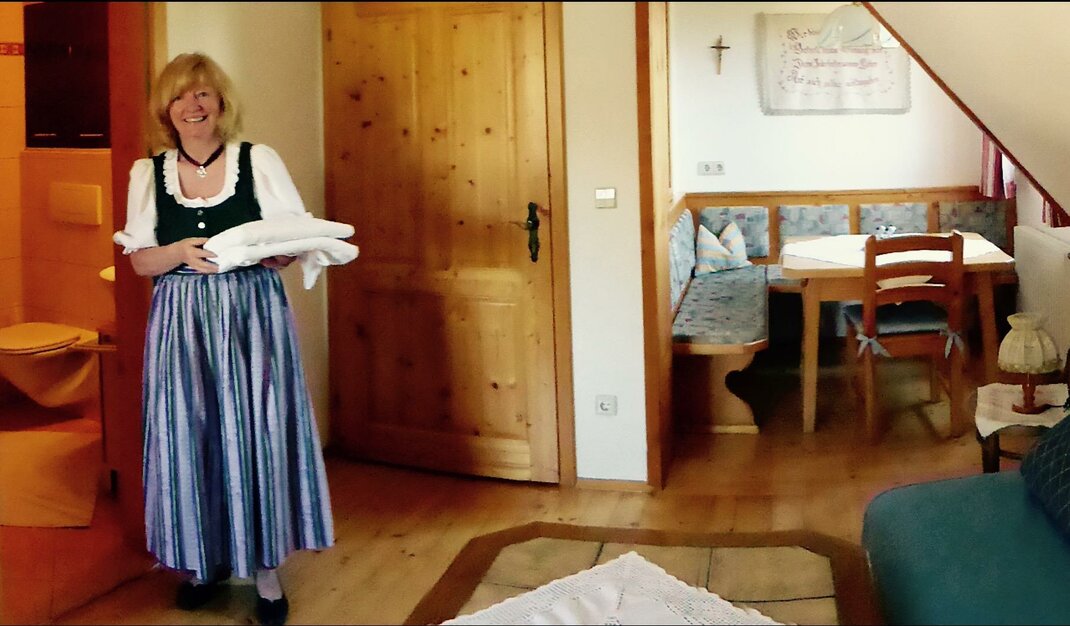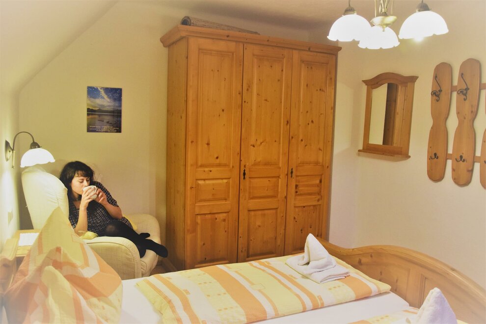 Pokoj "Waldblick" vás okouzlí svou přirozenou atmosférou ze smrkových stěn a modřínových podlah! Je vybaven manželskou postelí a rozkládací pohovkou pro dva. V koupelně je sprchový kout a toaleta. K dispozici je WIFI a fáze spánku je bez radiace! Pohled je orientován na hory na jih a ukazuje naše alpské lesy a bujné pastviny krav v létě!
