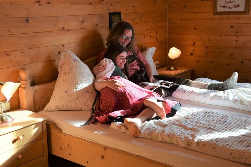 Pokoj Panorama si můžete rezervovat jako manželskou postel nebo jako 2 x 1 jednolůžko a rozkládací pohovku 140 x 200! Tento pokoj je ideálně kombinován jako druhá ložnice s dalšími apartmány nebo pokoji. K dispozici je sdílená koupelna. Pokoj je vyroben z našeho vlastního smrku a modřínu a nabízí velmi přirozené vnitřní klima se třemi velkými okny. Výhled na pastviny a lesy na jihu zanechává malebný dojem.