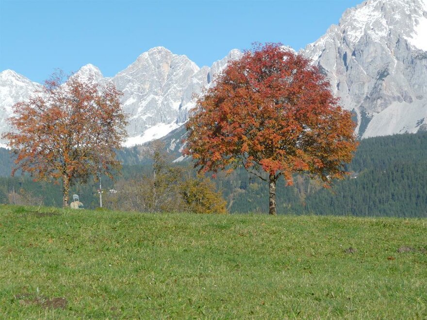 Rekreační byt jabloně se nachází v nově postaveném vedlejším domě. Byt je s 85 m² velmi prostorný a má 2 ložnice, každou pro 2-3 osoby (normální postele, žádná pohovka) a 2 koupelny (s dešťovou sprchou a rádiem) a také krásný slunný jižní balkon s výhledem do ovocné zahrady a na okolní hory. Kuchyň je plně vybavena (indukční sporák, trouba, mikrovlnná trouba, myčka nádobí a kávovar). Příjemný jídelní koutek se vyznačuje nádherným výhledem na Dachstein. K dispozici je lyžárna se sušičkou na lyžařské boty. Parkovací místo v přístřešku je pro vás rezervováno, pro další auta je zde k dispozici parkoviště.