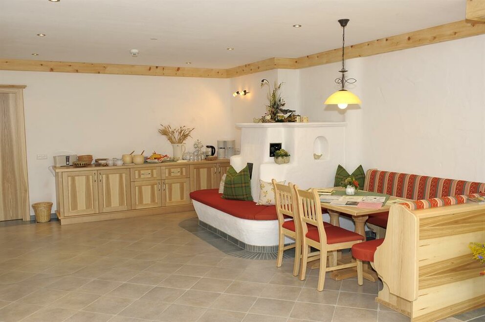 Mezi hlavním domem a penzionem se nachází naše místnost pro snídaně a odpočinek s vlastnoručně postaveným útulným kachlovým kamny. Večer se místnost pro odpočinek také ráda využívá pro společenské setkání nebo pro malé konference. K dispozici je zdarma velká plochá obrazovka včetně Wi-Fi. Na vyžádání rádi připravíme snídani formou bufetu. Od našich místních pekáren nabízíme službu čerstvých pečiv, čerstvé mléko z farmy a samozřejmě naše čerstvě snesená vejce od našich šťastných slepic.