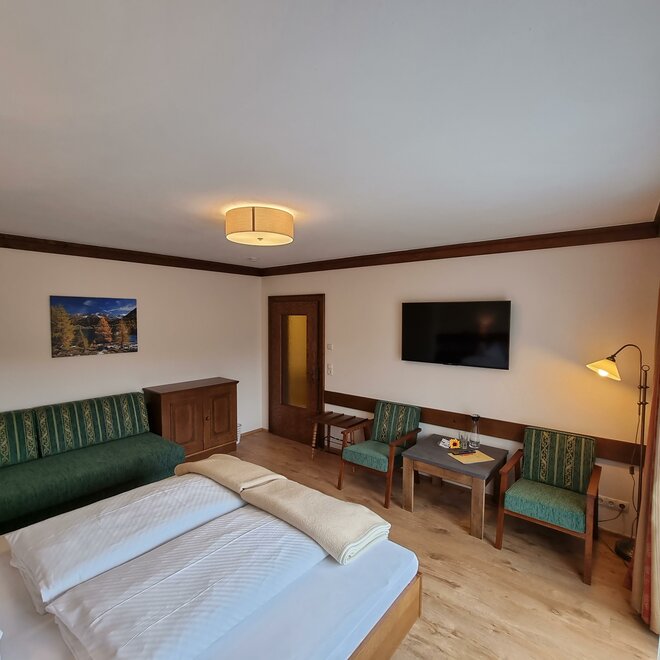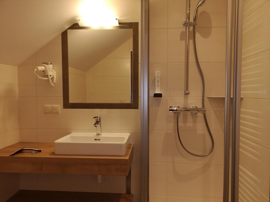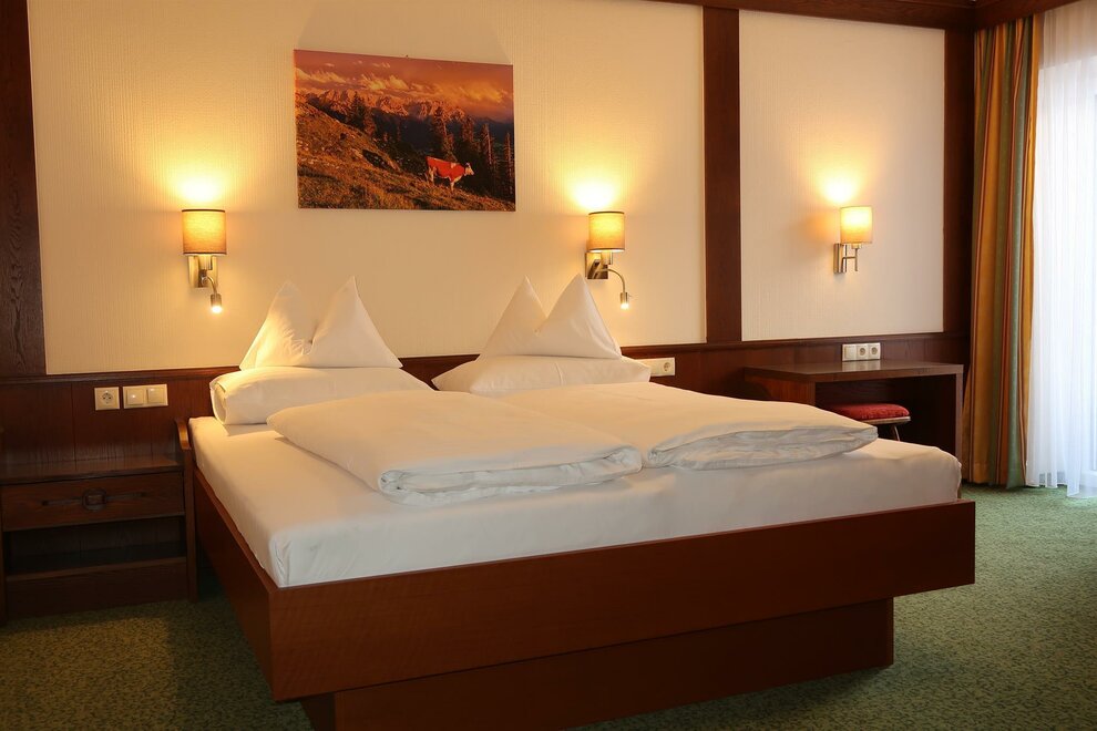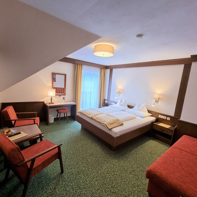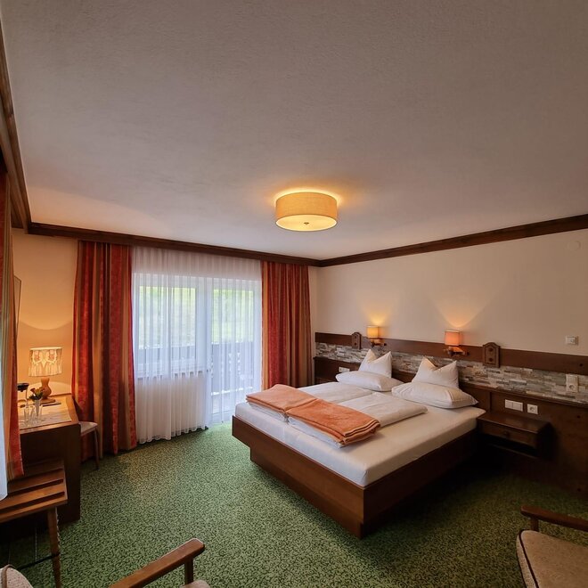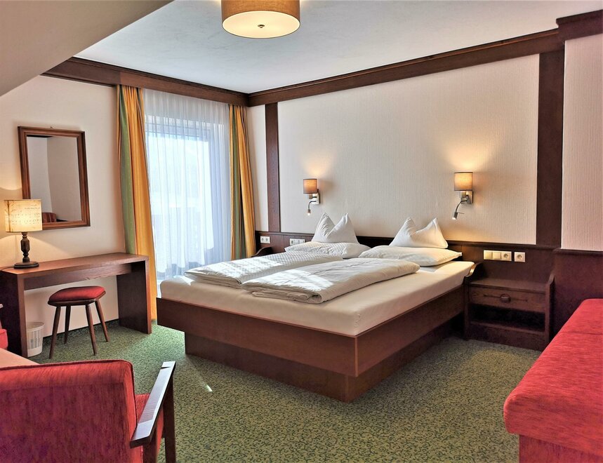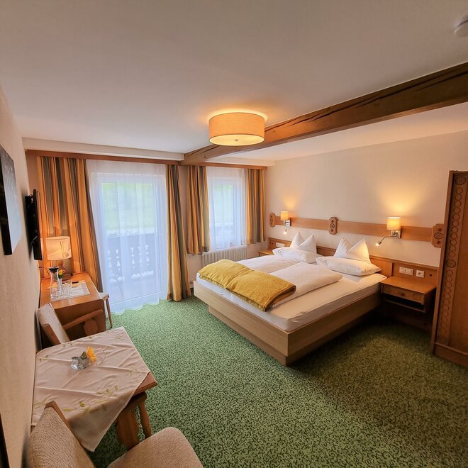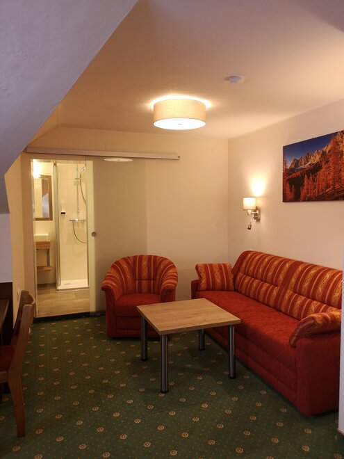 Útulný klidný pokoj v selském stylu, sprcha/WC, fén, rádio, satelitní TV, pohodlný sedací kout, lampička na čtení, částečně psací stůl, balkon s zahradním nábytkem.