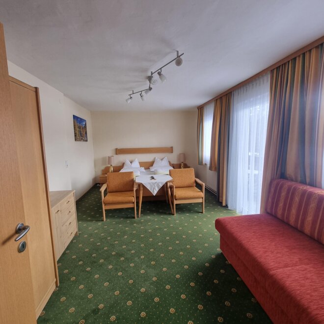 velký rodinný pokoj se 2 ložnicemi pro 4-5 osob, cca 37 m², sprcha/WC, fén, 2 x satelitní TV, útulný obývací kout, jihovýchodní balkon