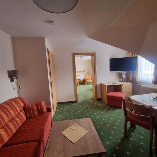 prostorný rodinný pokoj se 2 ložnicemi a propojujícími dveřmi, sprcha/WC, fén, 2 x satelitní TV, jižní balkon s krásným výhledem, zahradní nábytek, Wi-Fi