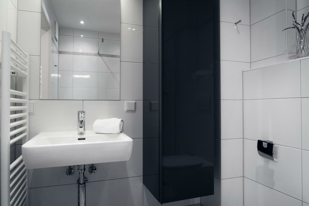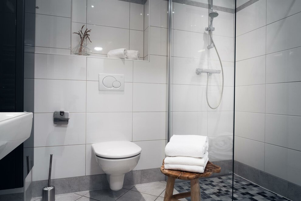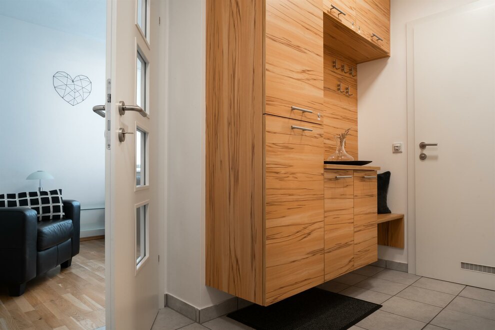 Moderně vybavený apartmán v přízemí nového domu nabízí 55 m² obytné plochy se dvěma samostatnými ložnicemi, plně vybavenou obytnou kuchyní, koupelnou se sprchou a dodatečným WC.
