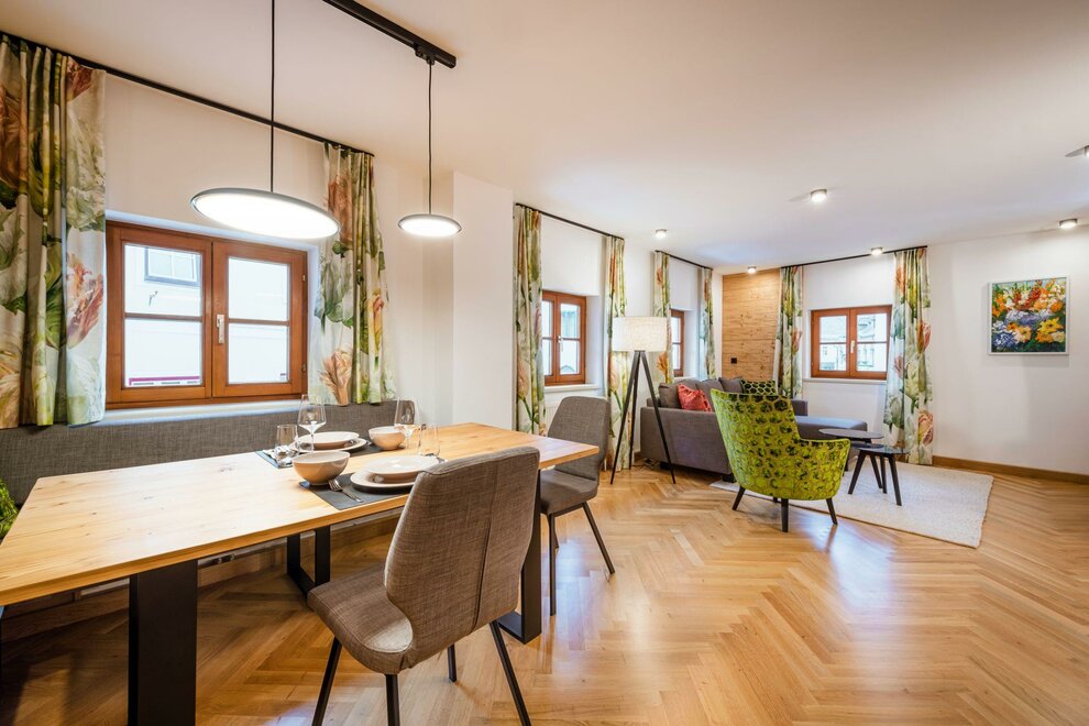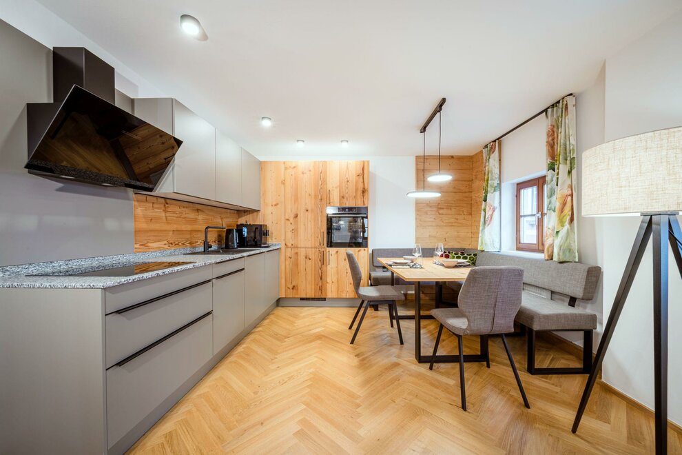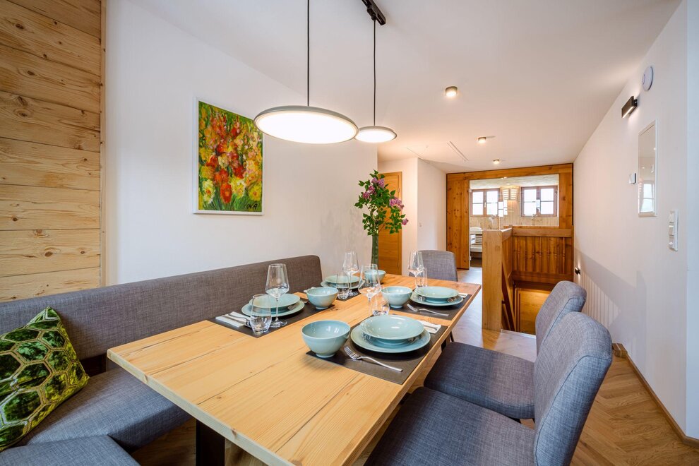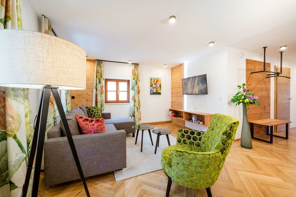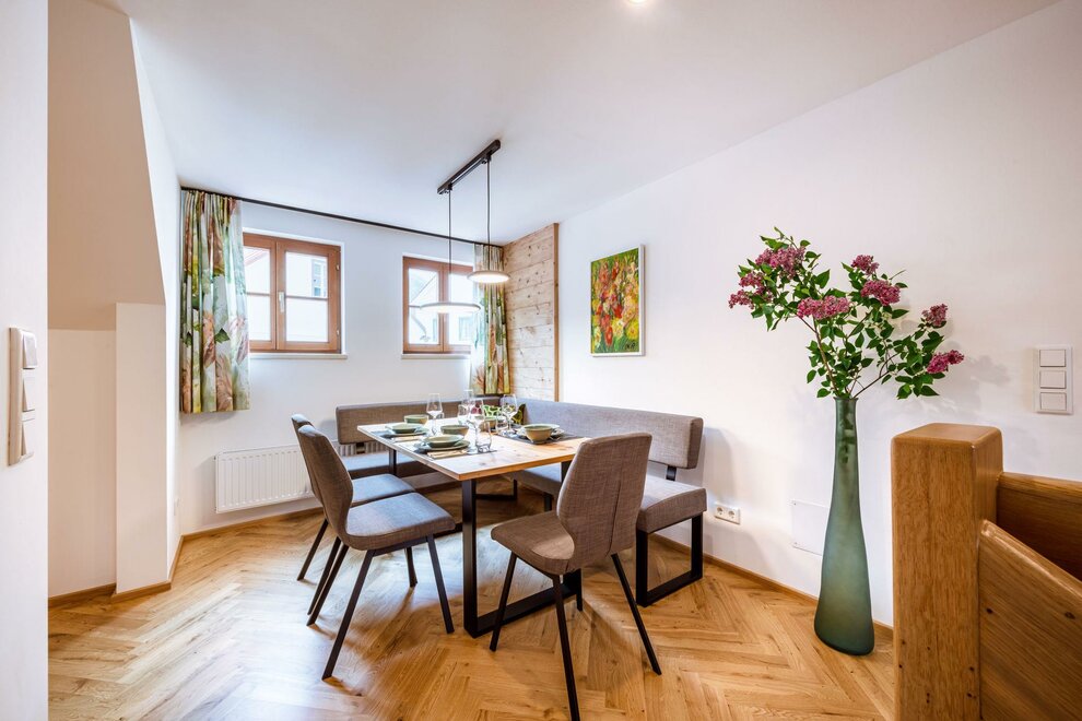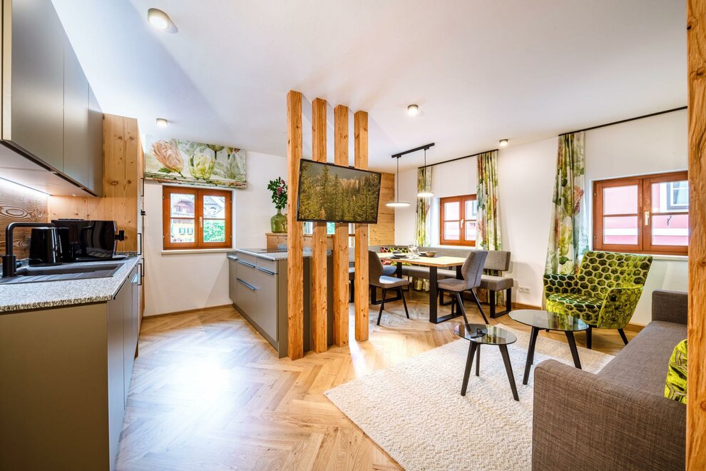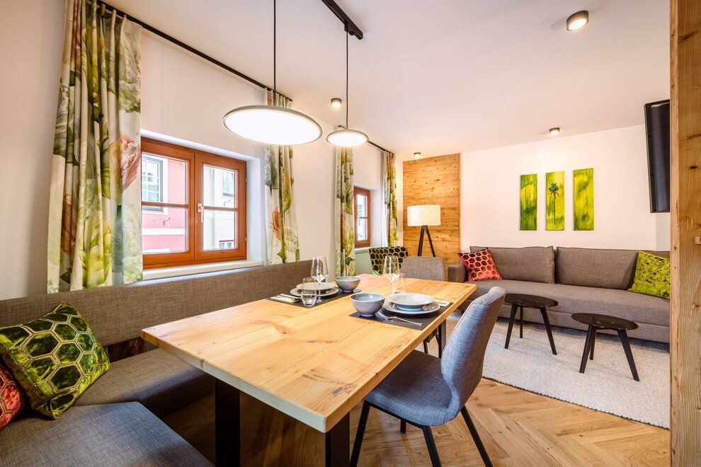 Bydlíte v útulné polovině domu ve 1. patře s nádherným balkonem s výhledem na historické náměstí a Grimming. Použití přírodních materiálů a regionální řemeslná umění dodávají interiéru útulnou atmosféru. Atraktivní výběr ušlechtilých látek, barev a vzorů spojuje stylový design s komfortním bydlením. Kvalitní parketová podlaha a moderní osvětlení dotvářejí luxusní prostředí. Zvláštním vrcholem je vlastní sauna z domácí jedlové dřeva, která zajišťuje relaxační chvíle.Vybavení pokojů