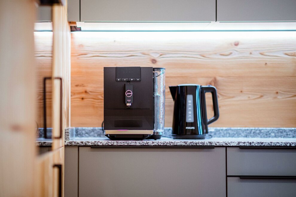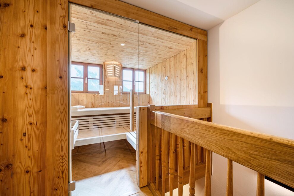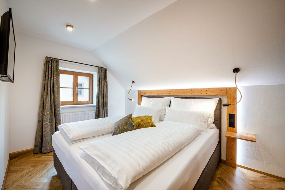 Užijete si pobyt v půvabné polovině domu ve 1. patře s nádherným balkonem s výhledem na historické náměstí a Grimming. Použití přírodních materiálů a regionálních řemesel dodává interiéru útulnou atmosféru. Působivý výběr ušlechtilých látek, barev a vzorů spojuje stylový design s pohodlným bydlením. Kvalitní parketové podlahy a moderní osvětlení dotvářejí luxusní atmosféru. Výjimečným prvkem je vlastní sauna z místního smrkového dřeva, která zajišťuje relaxační přestávku.Vybavení pokojů