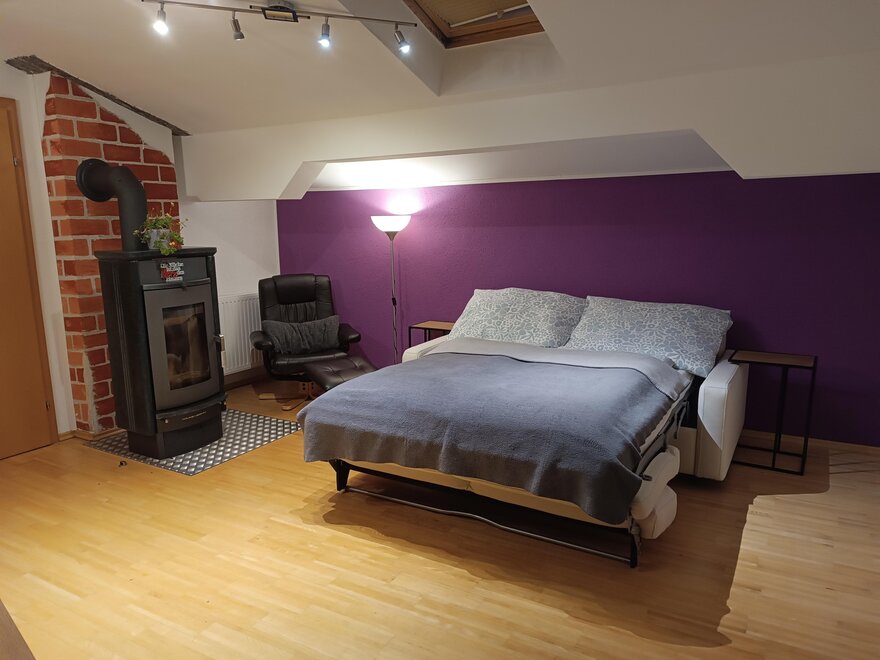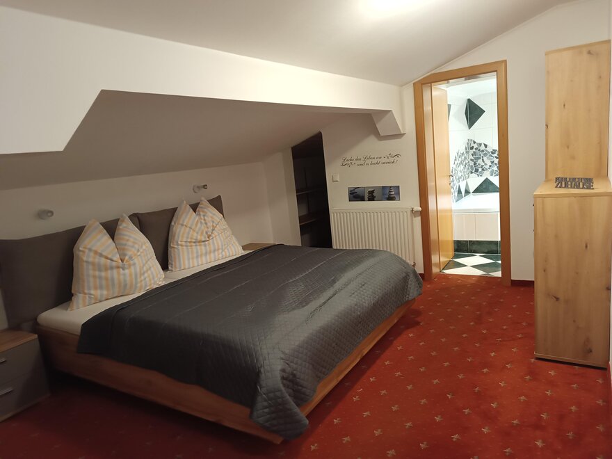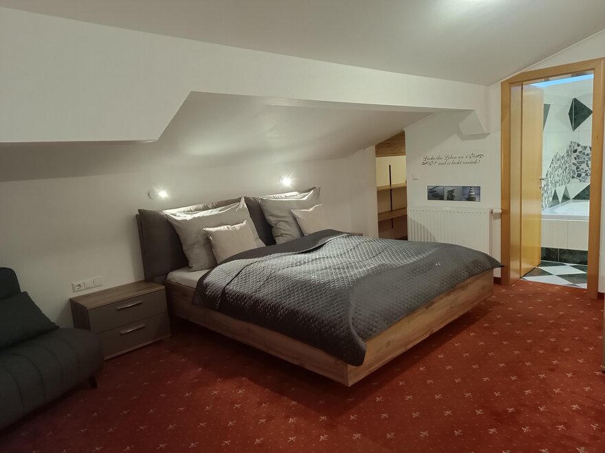 Má 1 ložnici s manželskou postelí (na požádání 1 přistýlku), 1 prostornou koupelnu s vanou, sprchou a WC,