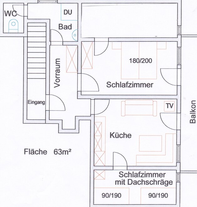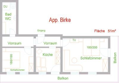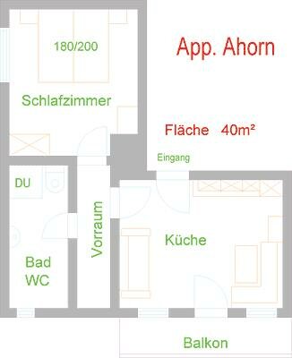 Pohodlný prázdninový byt pro 2 osoby, 40m², obývací kuchyně, ložnice, sprcha/WC, satelitní TV, jižní balkon.