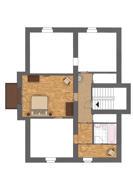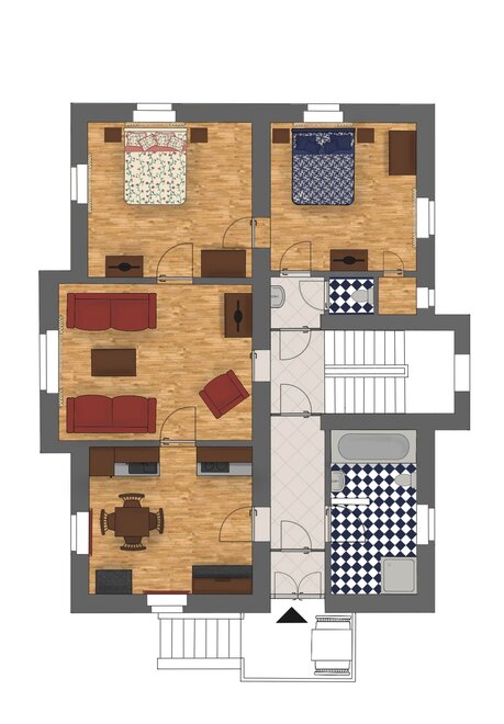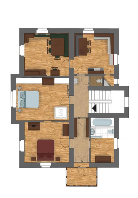 Prostorný apartmán Beletagese rozkládá na dvou patrech a 145 m² a nabízí místo pro až 6 osob. Tři ložnice, dvě koupelny s vanou, samostatné WC, plně vybavená kuchyň s troubou, elektrickým sporákem, myčkou, lednicí s malým mrazákem, mikrovlnnou troubou, toustovačem a kávovarem Nespresso a útulná místnost ze sibiřského cedru vytvářejí stylové prostředí s pocitem pohody.