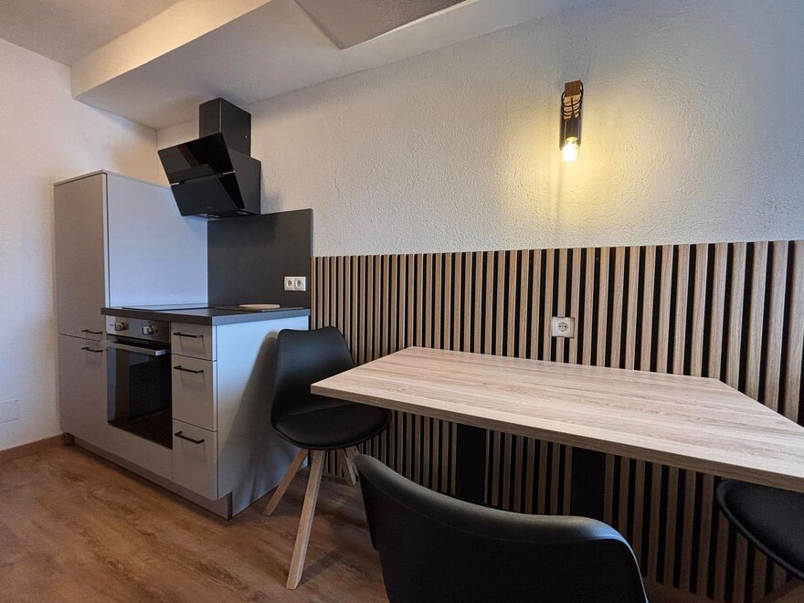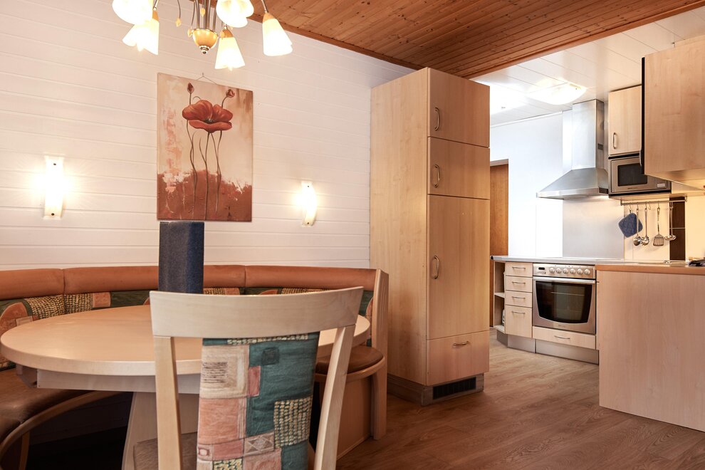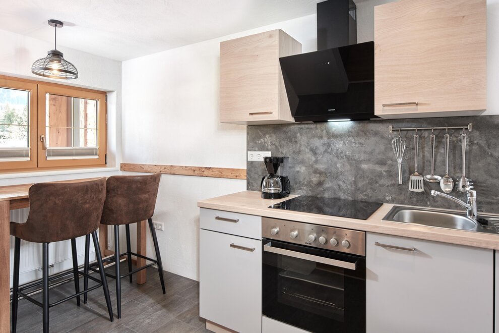 Kuchyň je částečně oddělena, ale stále otevřeně integrována do obytného prostoru a je plně vybavena pro nezávislý pobyt.