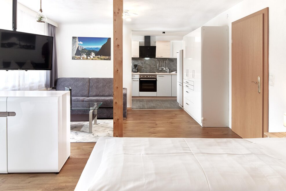 Tento přátelský studio apartmán spojuje obytnou a spací část v otevřeném uspořádání a nabízí příjemnou, vzdušnou atmosféru. Pohodlná manželská postel a obzvlášť pohodlná rozkládací pohovka pro až 2 osoby zajišťují kvalitní spánek – ideální pro páry, malé rodiny nebo přátele.