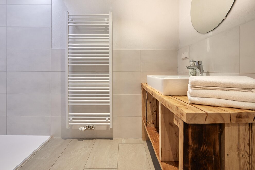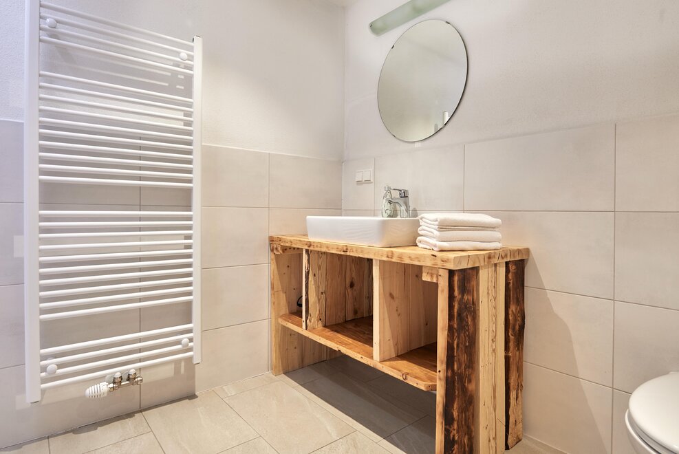 Koupelna je vybavena s velkou péčí o detail a nabízí sprchu, toaletu a ručně vyrobený umyvadlový stolek – skutečný unikát.