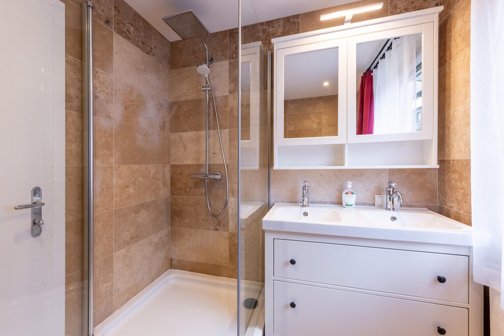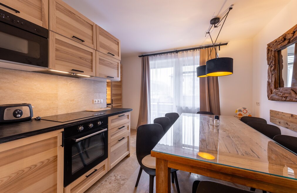 Apartmán nabízí na 95 m² obytné plochy prostorný obytný prostor s balkonem a přístupem do zahrady, 3 ložnice, koupelnu a WC, plně vybavenou kuchyň a extra WC a nachází se v přízemí