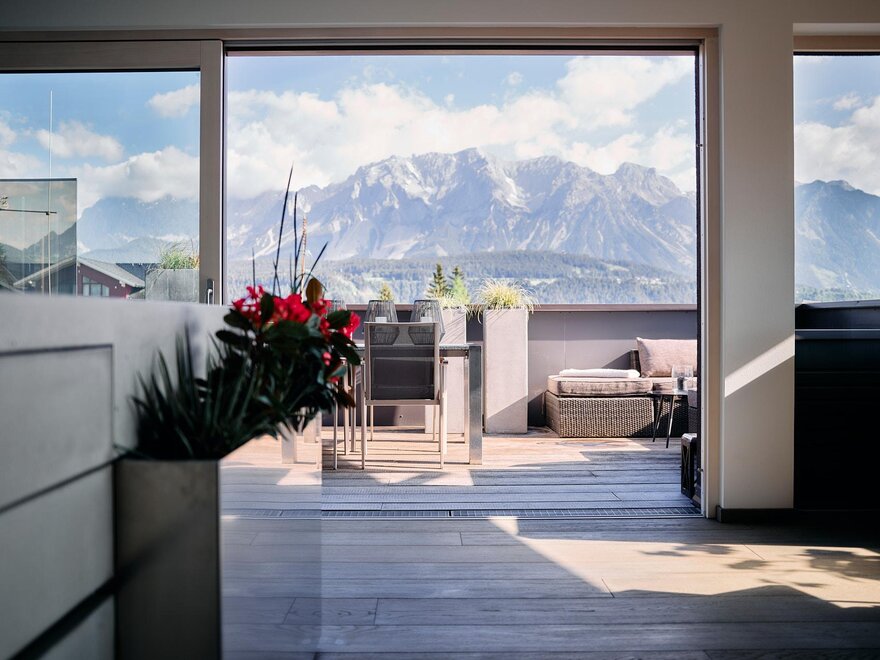 Krásný, nový, moderní panoramatický apartmán o rozloze cca 35 m². Skvělá poloha v skleněné věži s přímým výhledem na Dachstein.