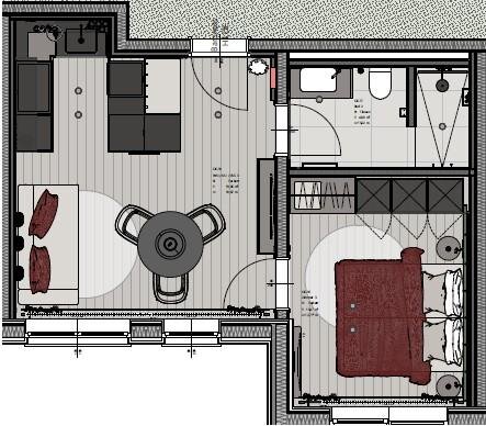 Byt 1 ložnice pro 2 až 4 osoby: 2 balkony s výhledem na hory, 1 ložnice s manželskou postelí a rozkládací pohovkou, obývací prostor s posezením a rozkládací pohovkou, 1 koupelna se sprchou, samostatné WC, plně vybavený kuchyňský kout