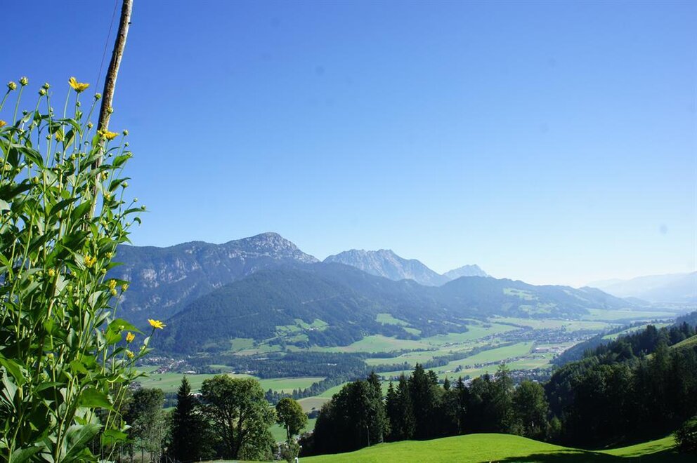 Scharlinger Alm pro až 20 osob: Chata s vlastním vařením přímo na sjezdovce s panoramatickým výhledem / 7 ložnic (3 dvoulůžkové, 1 třílůžková, 1 čtyřlůžková a 2 pro matrace) / velký útulný obývací pokoj s kamny na dřevo / plně vybavená kuchyň s lednicí a mrazákem, plynovým sporákem s troubou, stolním sporákem, myčkou nádobí, kávovarem / zastřešená terasa s možností grilování / místnost na obuv a lyže
