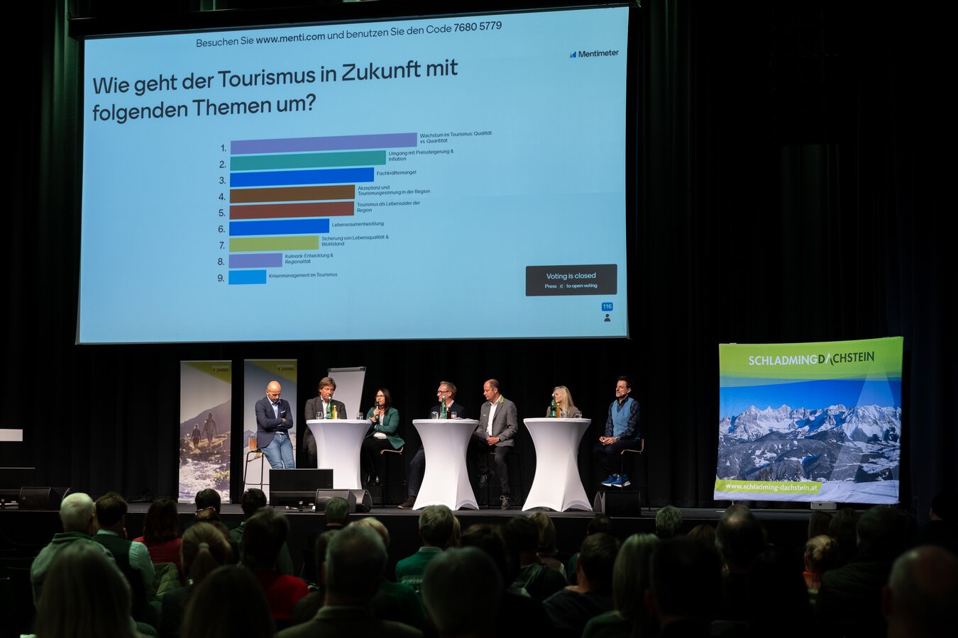 Im Anschluss an die hochkarätigen Vorträge fand eine Podiumsdiskussion mit den Experten sowie zwei Vermietervertreterinnen – Marion Gürtl vom Hotel Gürtl in Haus im Ennstal und Britta Wieser als Privatzimmervermieterin - zu den Themen Tourismuswachstum: Qualität vs. Quantität, Arbeitskräftemangel im Tourismus und die aktuellen Preissteigerungen und die damit verbundene Inflation statt. Diese drei Themen wurden von den 300 anwesenden Besuchern als die derzeit brennendsten Herausforderungen im Tourismus genannt. Aus den vielseitigen Meinungen am Podium konnten die Teilnehmer wertvolle Erkenntnisse gewinnen.