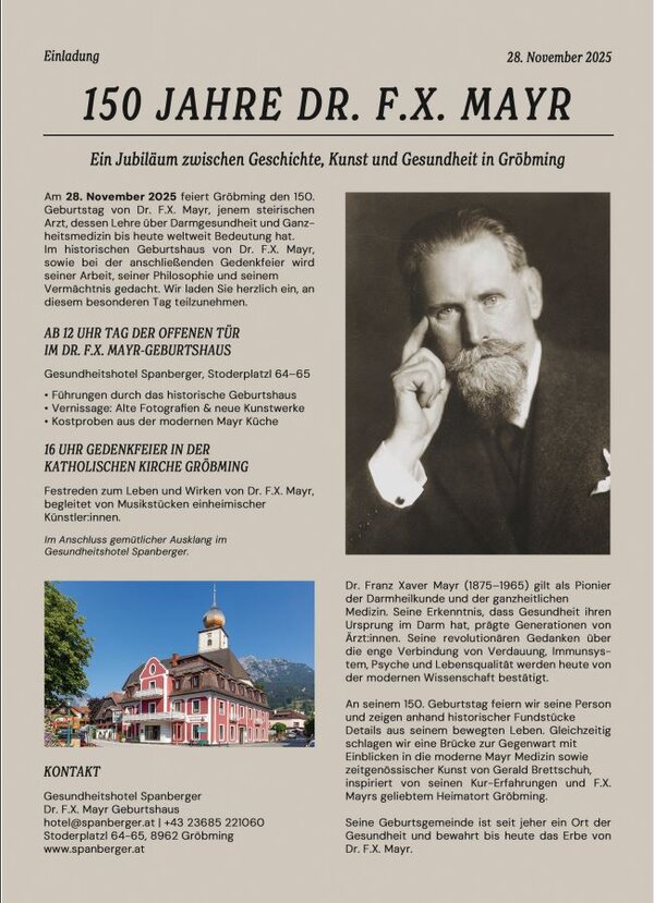 Am 28. November 2025 feiert Gröbming den 150. Geburstag von Dr. F.X. Mayr, jenem steirischen Arzt, dessen Lehre über Darmgesundheit und Ganzheitsmedizin bis heute weltweit Bedeutung hat.