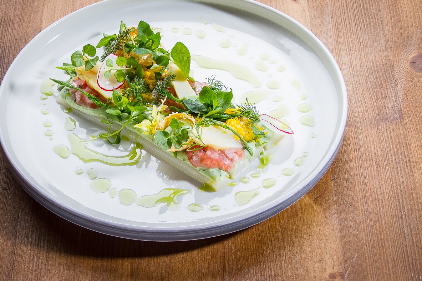 Kalbs-Kirsch Tatar mit grünem Spargel und Molke