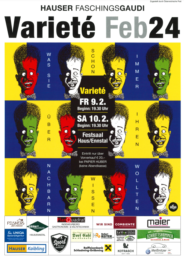 Eintritt nur mit Vorverkaufskarte (€ 20,00) - limitiert erhältlich beim Papierfachgeschäft Huber in Haus im Ennstal