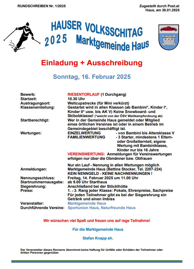 Einladung zum Hauser Volksschitag 2025 der Marktgemeinde Haus