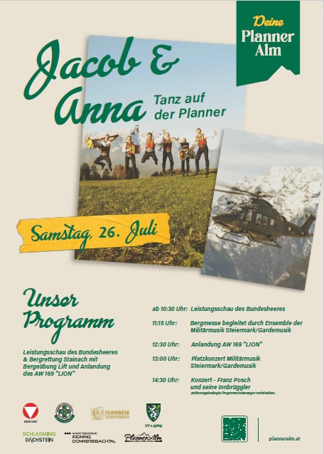 Am 26. Juli wird die Planneralm wieder zur Bühne für Brauchtum, Musik und beeindruckende Vorführungen! Unter dem Motto „Jacob & Anna – Tanz auf der Planner“ erwartet euch ein abwechslungsreicher Tag auf der Alm mit stimmungsvoller Musik, beeindruckender Technik und echter Volkskultur.
