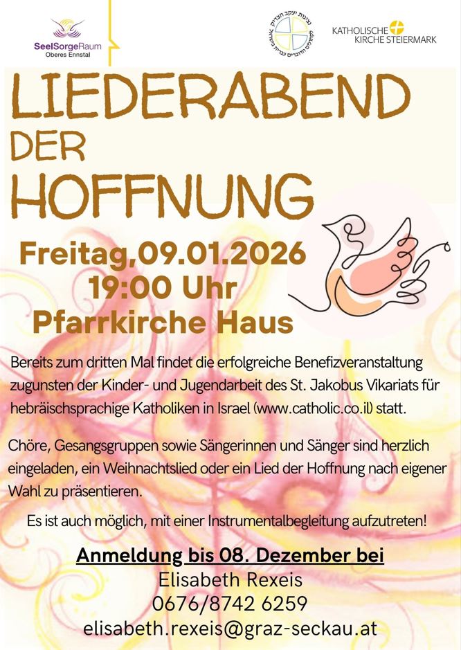 Herzliche Einladung zum Liederabend der Hoffnung am Freitag, 09.01.2026 um 19:00 Uhr in der Pfarrkirche Haus im Ennstal.