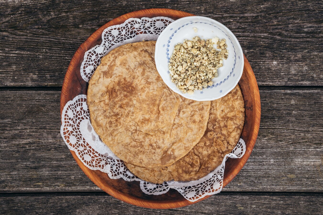 Die Zutaten zunächst zu einem Teig vermischen und diesen dann zu daumendicken Rollen formen. Davon rund 10 Zentimeter lange Stücke abschneiden und zu dünnen tellergroßen Roggenkrapfen auswalken. Danach in sehr heißem Schmalz kurz auf beiden Seiten schwimmend herausbacken, auf einer Küchenrolle abtropfen lassen und zudecken.