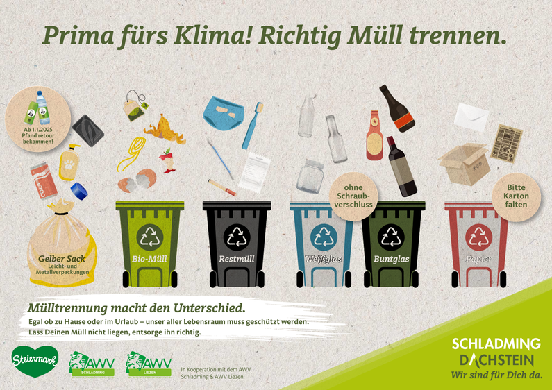 In der Region Schladming-Dachstein legen wir großen Wert auf den Schutz unserer wunderschönen Natur. Eine einfache, aber wichtige Maßnahme ist zum Beispiel die korrekte Mülltrennung - damit kann jeder von uns einen wertvollen Beitrag leisten. Jede richtige Mülltrennung spart wertvolle Ressourcen, schützt unser Grundwasser und hilft die Natur, die Du hier genießt, auch für zukünftige Generationen zu bewahren. So schonen wir Ressourcen und tragen zum Klimaschutz bei. Ein einheitlich und übersichtliches Informationsblatt soll Gastgebern und Gästen der Region dabei helfen, durch die richtige Trennung von Restmüll, Kunststoff, Glas, Papier und Bioabfall einen Beitrag zu einem sauberen Lebens- und Erholungsraum zu leisten.