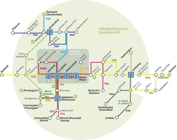 Mit der Sommercard in der Tasche bist du bequem und kostenlos mit 13 regionalen Buslinien unterwegs – und das schon ab 13 Uhr am Anreisetag. (Die Sommercard erhältst du bei Nächtigung in einem teilnehmenden Betrieb in der Region Schladming-Dachstein.)
