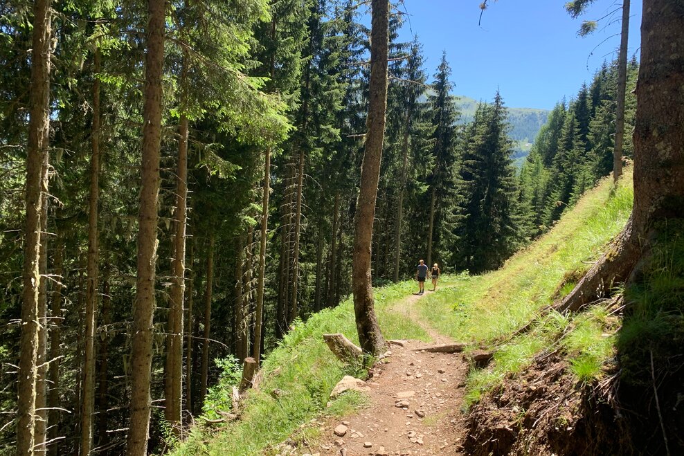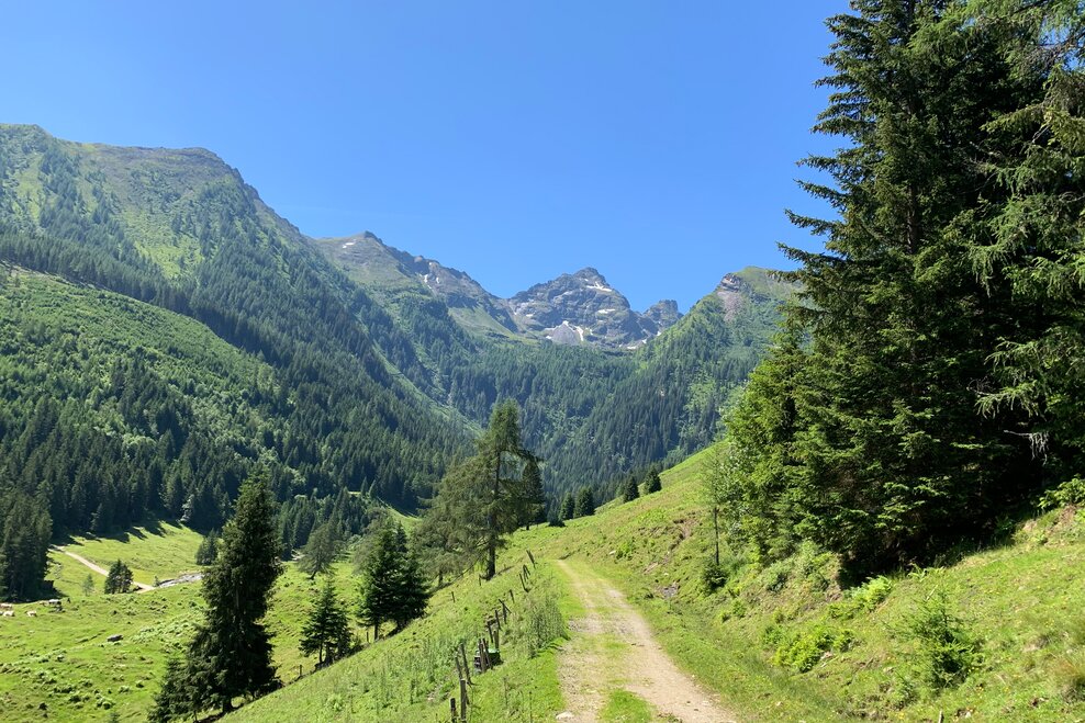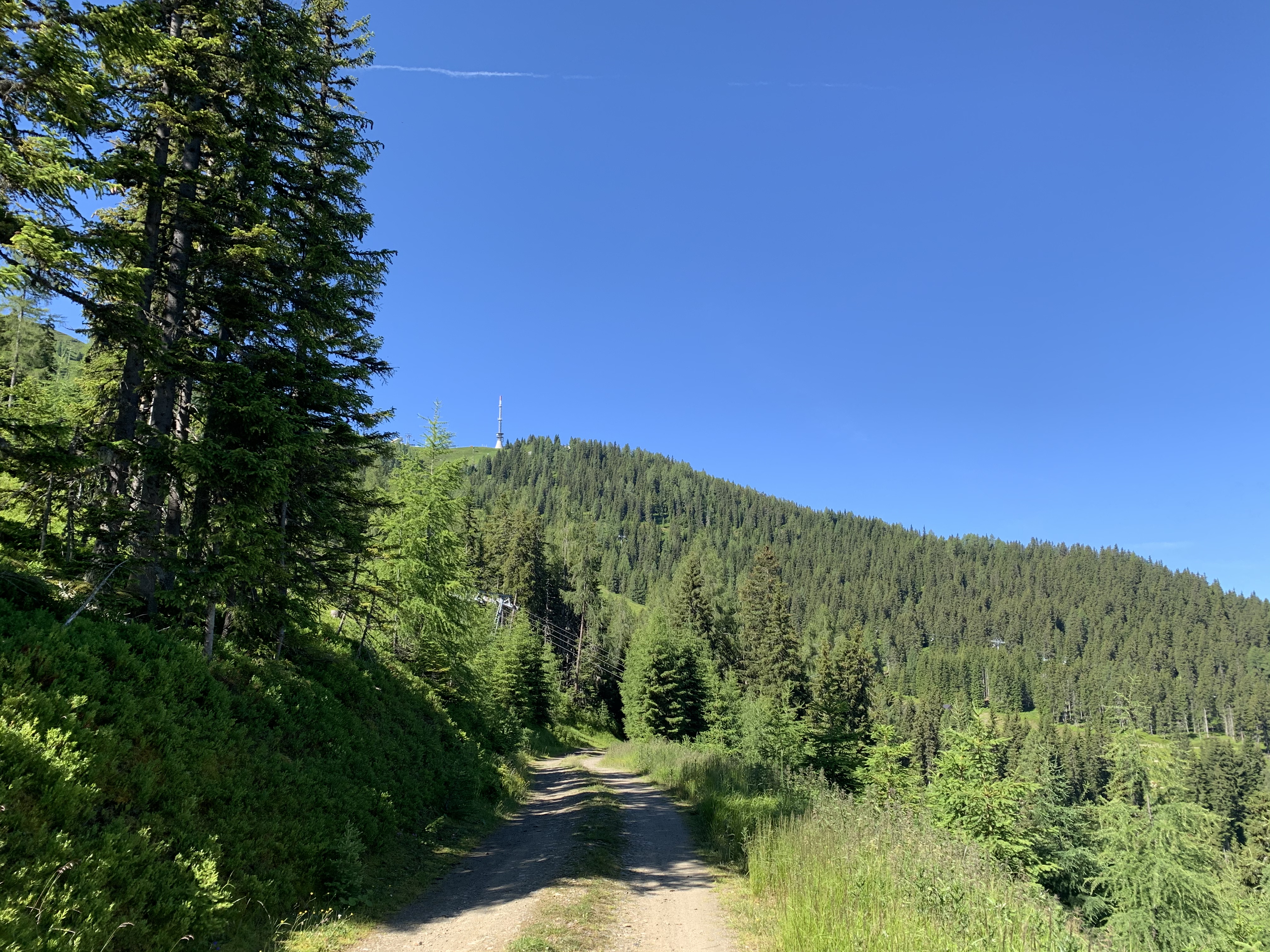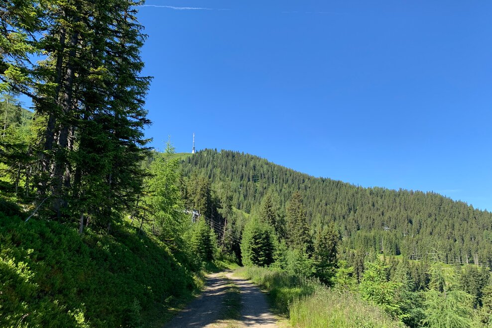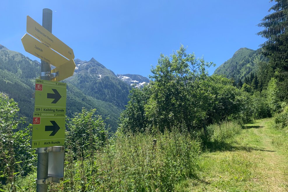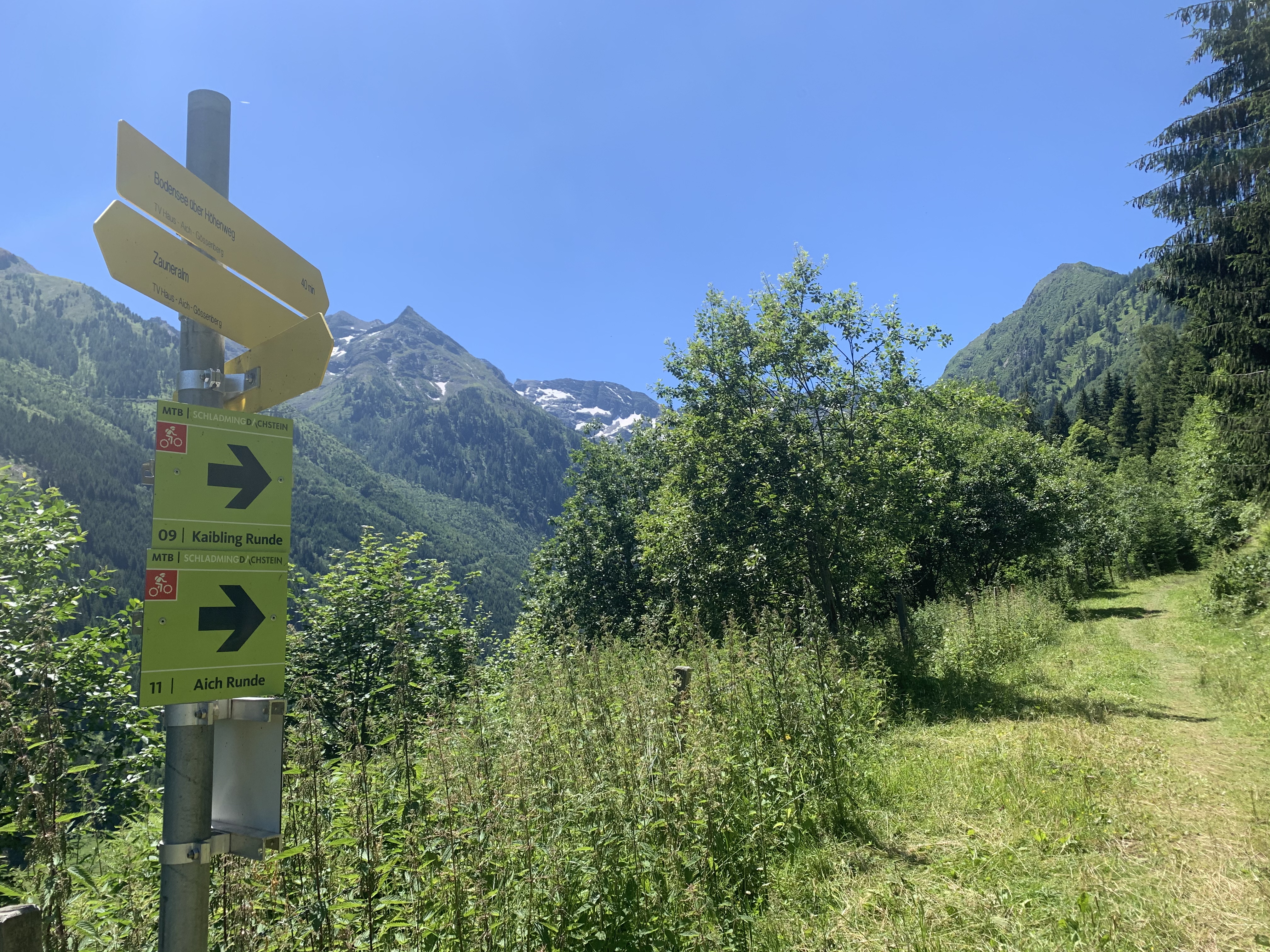 Pünktlich zur ersten Bergfahrt um 9 Uhr morgens steigen wir bei blitzblauem Himmel in die gelbe Gondel. Unsere Tour beginnt an der Bergstation der 8er-Gondelbahn, wo wir direkt nach dem Ausstieg den Wegweisern "09 Kaibling Runde" folgen. Nach einem kurzen Anstieg von zirka 150 Meter geht es über einen schönen Almbodenweg bequem weiter. Die erste Etappe begeistert mit einer beeindruckenden Baumvielfalt und dem unwiderstehlich süßlichen Duft von wilden Schwarzbeeren (auch Blau- oder Heidelbeeren genannt), welche am Wegrand in Hülle und Fülle wachsen. Der Blick in die Ferne entführt in eine atemberaubende Szenerie aus markanten Gipfeln. Im Norden der Hohe Dachstein (2.995 m), im Osten der Stoderzinken (2.048 m), Kammspitze (2.139 m) und der mächtige Grimming (2.351 m) und bei der Einfahrt ins Gumpental begrüßt imposant die Bärfallspitze (2.150 m) und der Höchstein (2.543 m).